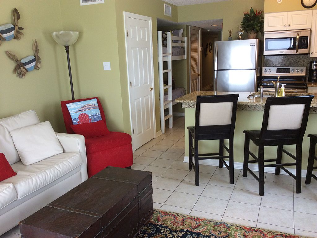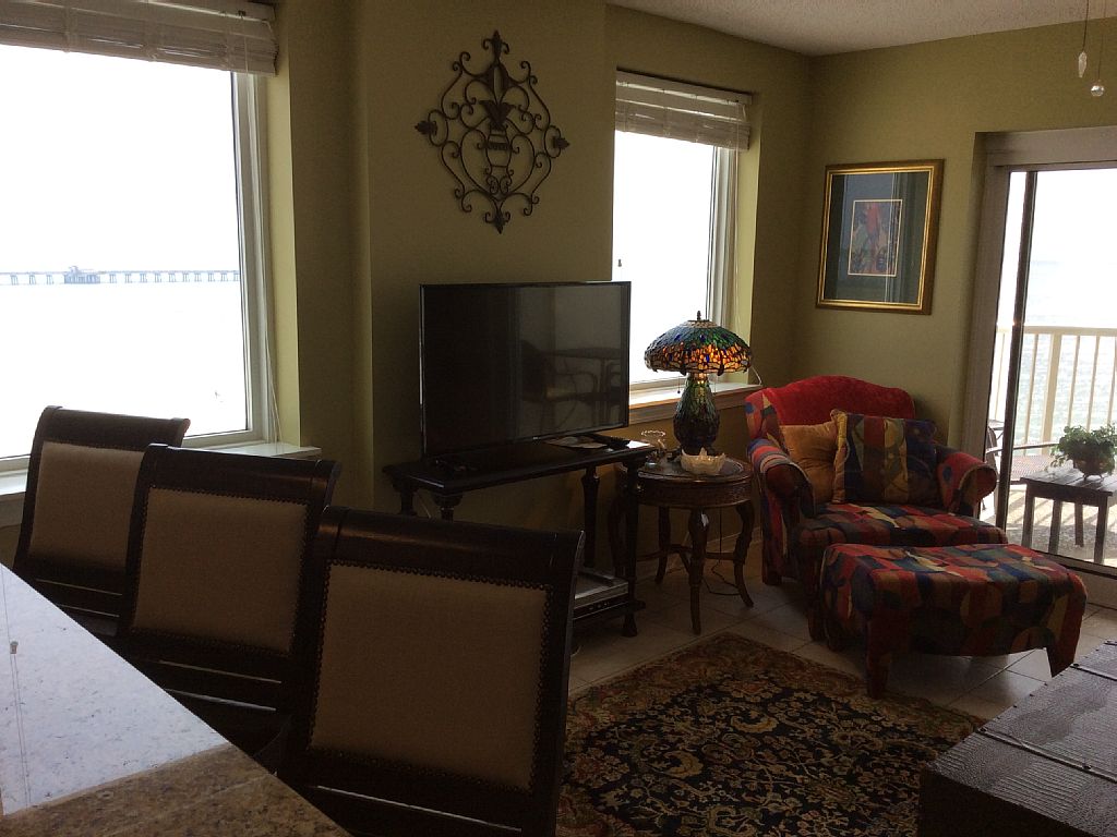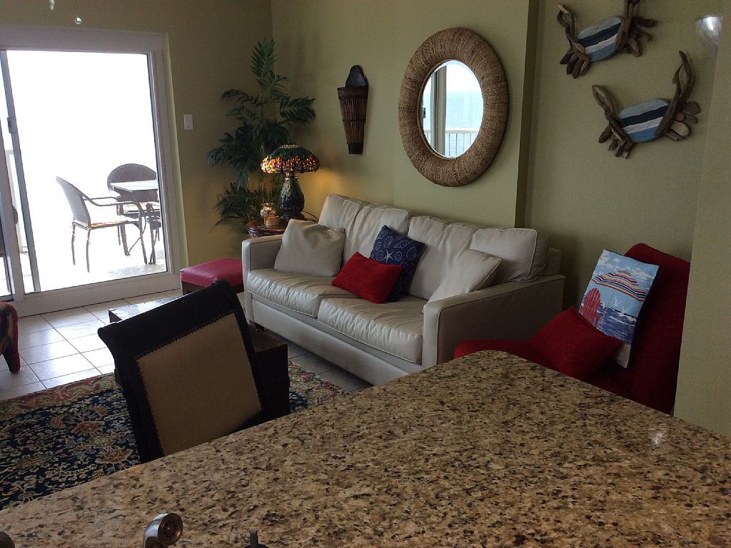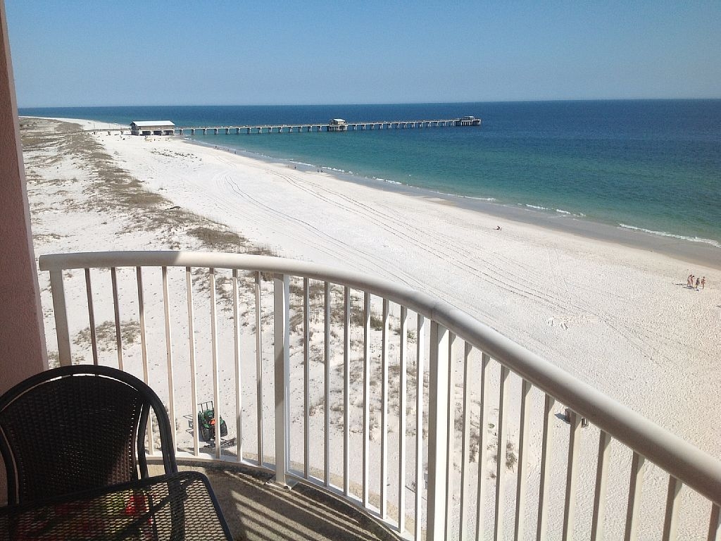 This east corner condo unit is located on the ninth floor with breathtaking views of the gulf from each room in the condo. We recently remodeled our condo for your vacation retreat as you enjoy overlooking the white sandy beaches of Gulf Shores! Our remodeled condo can be your next vacation location! We have new granite countertops in the kitchen along with new stainless steel appliances. There are fantastic views from every room -- in the master bedroom you have sweeping views of the Gulf State Park, the Gulf State Pier, and the gulf from the bed as well as the other bedroom. Our condo has fabulous quality mattresses and bed linens. There are flat screen TVs in each bedroom and also in the living room. We also have great outdoor balcony furniture as you relax and feel the breeze of the ocean and listen to the waves. Our condo is comprised of the following:• King in the master bedroom -- with large dual area master bath, flat screen TV, and large walk in closet in the master bedroom • Queen in the guest bedroom --with a bathroom in the hallway, flat screen TV, and closet as well in the guest bedroom• There are twin bunk beds in the hallway – great for kids• The sofa converts to a sleeper (queen) in the living area –with a flat screen TV for the living area and two comfortable accent chairs for relaxing• The kitchen has all new stainless steel appliances. The kitchen is fully equipped with small appliances and all of the necessary cooking utensils • There is a washer and dryer in the hallway -- linens are provided for your stay• Our balcony is also a great refuge with a table and chairs along with a lounging chair. It is a perfect place to enjoy breakfast, lunch, or even an afternoon snack. We love sitting around and talking on our balcony with friends. I am sure that you will love it!• We have beautiful pools which include an indoor pool and an outdoor pool. We have a hot tub, sauna, and fitness center in Royal Palms as well. Royal Palms is such a desirable rental because it has all the amenities of larger condos without the higher price. Also, Royal Palms is situated on western edge of our state park, which provides ultimate privacy. The balcony is a wrap which provides awesome views of the beach and Gulf of Mexico. My favorite part about staying at the Royal Palms is the location on the beach! More details