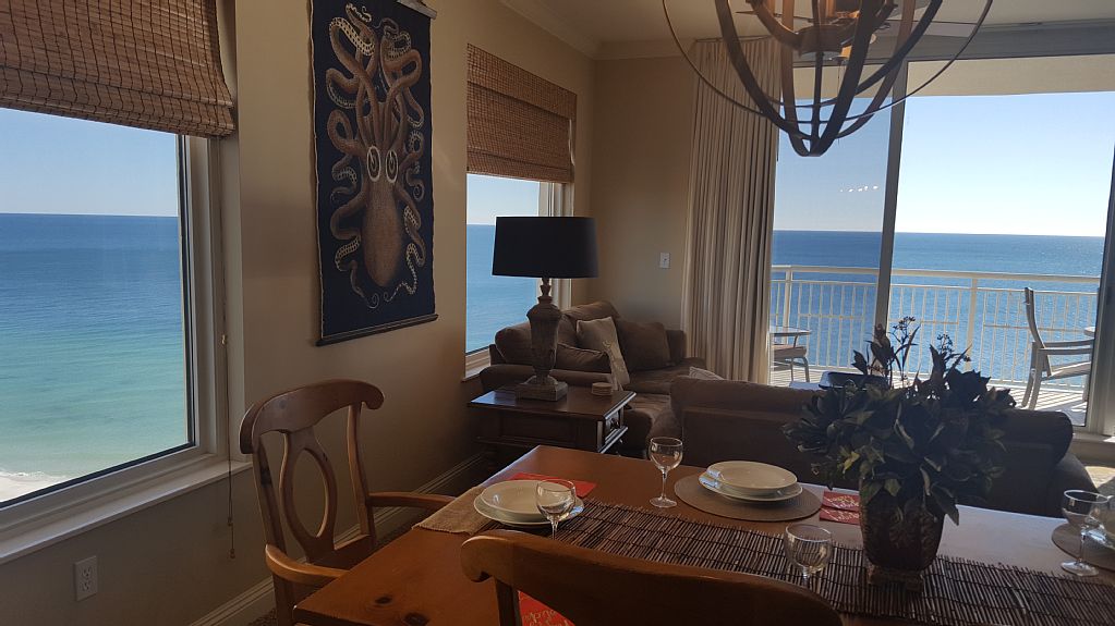 Experience this stunning and luxurious 14th floor home with water views from every window! It is a fabulous CORNER unit with 3 bedrooms, 3.5 baths and a den situated on the the pristine white sand beaches of Perdido Key. The Indigo Resort is the newest and most desired vacation destination on Perdido Key. Voted to have some of the most beautiful beaches by Conde Nast Traveler. This amazing Indigo Resort condominium has just been purchased by new owners that have just completed (December 2016) redecorating of the unit. Having a CORNER unit means that there are an extra seven windows in the living room, dining, kitchen, den and bedroom that allow natural light to pour in and add to the open feel of the large living areas and afford wonderful and unbelievable sunshine-filled views of Perdido Key that interior units cannot provide.The unit comfortably accommodates 8-10 guests. Escape to the Master bedroom featuring a huge picture window with a panoramic view of the gulf and an enormous walk-in closet. The Master bath highlights an oversized jetted garden tub, a separate glass and travertine tiled shower, double vanities and travertine floors. A second master offers an additional king bed and bath, a third bedroom has two double (full) beds also with it's own bath and a sofa in the den that transforms into a queen bed. The unit has a spacious living room offering both comfort and style, a huge 65 inch flat-screen TV (5 flat screens in all), floor-to-ceiling windows and beachfront balcony with table and chairs and a chaise lounge. You can enjoy your morning coffee, savor your favorite cocktail and even enjoy dinner al fresco while delighting in the tranquil sounds of the surf! The dining room table can easily seat 8 plus. You will also have the convenience of a full size washer and dryer in your unit, free wireless internet and a trash chute right outside your door. Seasonal beach service with your own chaise lounges or chairs and umbrella is included with your rental from March to October.The panoramic views of the white beaches and aquamarine waters are testaments to why Perdido Key is one of the most desirable destinations on the Gulf Coast! The fully equipped kitchen features upgraded appliances, granite countertops, travertine floors and custom wood cabinetry.The Indigo Resort is an exquisite 7-acre complex is situated upon one of the world's most magnificent seashores, where miles of sugar white sands give way to the sparkling emerald waters of the Gulf. Undulating wind built sand dunes are dotted with sea oats and beach grass. The picturesque beaches of Perdido Key are unparalleled, creating the perfect setting for the most memorable vacation imaginable.Indigo features the most luxurious amenities offered on the Gulf Coast, including seven acres of exquisite landscaping, private gated entry, a spectacular 6000 gallon zero entry resort-style pool that is one of the largest on the entire Florida Panhandle. There is also a hot tub, an additional seasonally heated smaller pool, outdoor grills, Green egg, lighted tennis courts, steam rooms, saunas, two state of the art fitness rooms, a private 12 person theater, dedicated check-in desk, garage parking, and private interior elevator access that go straight to your own private foyer, which is characteristic of each Indigo unit!Period Key is nestled amidst the pristine shores of Florida's Emerald Coast and is rapidly becoming a favorite vacation destination for those who want to enjoy the tranquility of coastal living without the congestion found in other destinations. Beachcombing, fishing and sailing are ways of life not just recreation choices. Perdido Key's unspoiled beaches are one of the island's main attraction.Perdido Key offers fantastic restaurants, championship golf courses, water sports and lovely shops and boutiques. Orange Beach is a 10 minute drive west and hosts tons of great restaurants, shops and recreation as well. Visit Indigo and finally experience the vacation of your life.Indigo Resort Condominiums are located on the beautiful Gulf of Mexico with 800 feet of private beach. Boardwalk access to the beach is convenient and only steps away from swimming, playing, shelling, crabbing, or just simply relaxing. The resort features a tropical pool oasis complete with waterfalls, a children's play area, elevated spa, and gazebo. Our guests may also reserve the movie theater - there is seating for twelve, hundreds of DVD movies to choose from, or sports channels! There are two state of the art fitness centers, separate men's and woman's sauna and steam rooms, or enjoy the fireplace in the social room. Take a walk down the beach, go for a jog through Big Lagoon State Park or play tennis at the resort on the HydroCourt surface. Outside of Indigo's gated property, and conveniently located, you will find Naval Air Station Pensacola. This base is home to the United States Flight Demonstration Squadron, the Blue Angels! Enjoy the museum which is designed for all ages, the IMAX theater, or climb the 177 steps of the spiral staircase to the top of the Pensacola Lighthouse. The views are absolutely breathtaking! Pensacola is located only 15 miles from Perdido Key offering a wealth of day trip options.The Perdido Key area also offers World Class Golf Courses, deep sea and inshore charter fishing, dolphin tours, snorkeling, hiking and bicycle paths, and water craft rentals. Enjoy fine dining, a casual lunch, and always the best seafood! We look forward to welcoming you to our home...your vacation destination awaits. More details