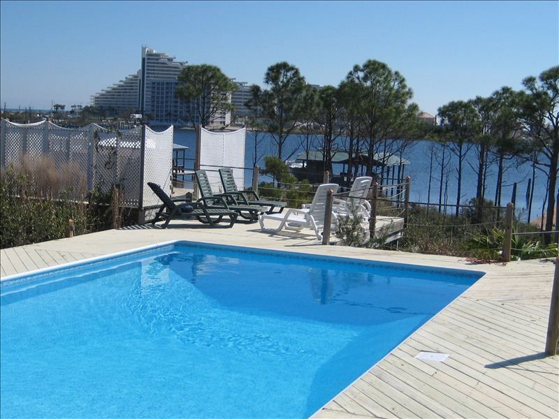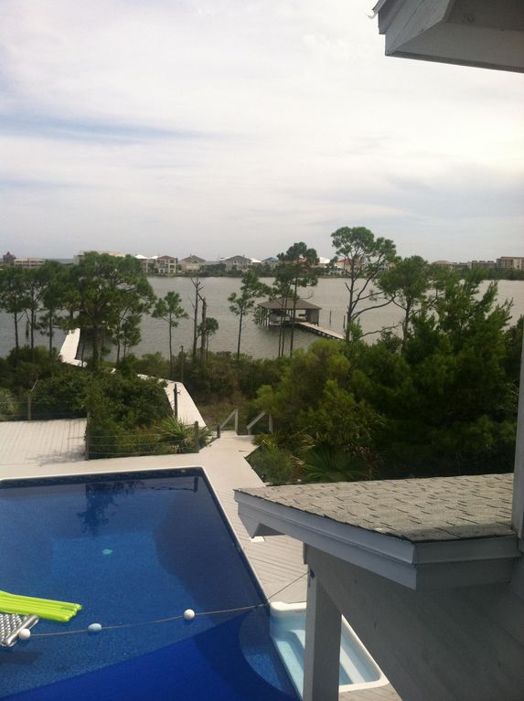Josie's Place is located on Ono Island overlooking Ole River with close accessibility to the Gulf of Mexico via Perdido Pass. Beautiful public beaches in Orange Beach and Gulf Shores just minutes away.Home includes a private pool, spa, boat dock w/sun deck and pier making it a wonderful place for swimming, fishing and boating. The second level includes living room, dining area including breakfast bar for six and large kitchen with all amenities. Two master bedrooms, king-sized beds and private baths also on second level.. Third level includes large great room, two oversized bedrooms with 2 queen size beds in each. Each bedroom has private bath with shared tub/shower area. All bedrooms have porches overlooking pool. Lower level has game room with pool table , wet bar and pull out queen-sized sofa. A bedroom with queen bed and private bath are also located on lower level.Keywords: Beach house, pool, spa, dockage, 5 bds., 2 living rooms, pool room, sleeps 16, close to beach and conveniences.