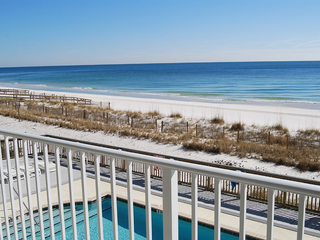 This affordable beachfront condo is located 'Right on the Beach'. It offers fantastic views of the Gulf from two directions as it is located on the East corner of the high-rise building, so you can enjoy both sunrise and sunset from your private beach side balcony. The unit is on the second floor above the beach. This high-rise is located between the pristine Gulf Island National Seashore, and the Florida State Park Beach, both famous for gleaming white sand beaches. The location is convenient to several great restaurants, shopping areas, historical interest sites, and amusement areas. The unit features a large bedroom w/King bed, plus a fold-out couch in the living room to sleep up to 4 adults, and there are two built-in 'Captain's bunks' for 2 small children (3 -12 years old).