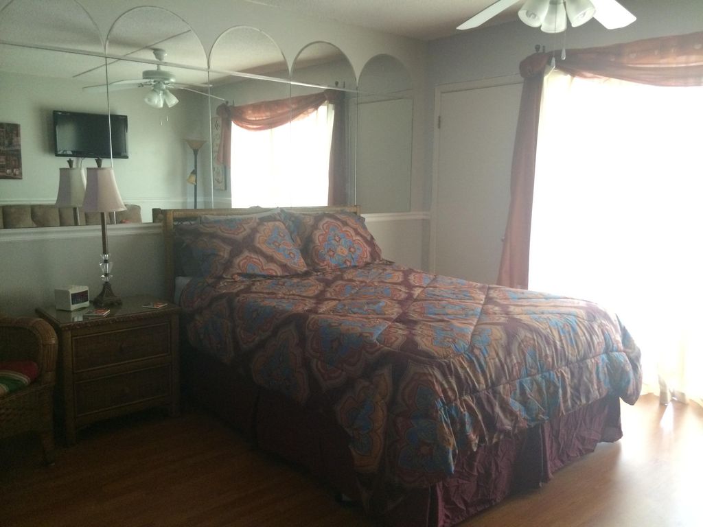 Welcome to our vacation home, 'Condeaux on the Beach II.' Our condo is the perfect romantic get away for 2, or a fun visit for a small family (2 adults & 2 small children) retreat. You will simply love the white sugar sands of Orange Beach! Our condo is located on the 1st floor of the building on the left side of the Sugar Beach parking entrance. We have taken great pride in updating the interior, and to ensure that every comfort of home is accommodating to you. Our cozy beach side Studio vacation home is freshly painted, and has a comfortable wicker queen sized bed for a restful night's sleep. There is also a new sofa that converts to a shorter in length double bed, and a chair for relaxing while watching the 32'' HDTV and 26'' flat screen HDTV/DVD Combo TV. There is ample space for your clothing with a full size closet, a chest of drawers and a nightstand. The bathroom is serene and stocked with many amenities. Our kitchen is very vibrant and fully equipped with a coffee maker, toaster, and everything you need, making it a joy to prepare meals, or a romantic dinner! For your dining indoors there are 2 bar stools at the bar and 3 nesting tables by the sofa to be used as individual tables. The balcony is accessible from the living area and provides beautiful relaxing views of the gulf and beach from our new outdoor patio set. Enjoy dining outdoors, having coffee or tea, or taking in the beach views, and realize there's no other place you'd like to be! Additionally, our vacation home has FREE wireless internet and cable television! All linens are provided with the exception of beach towels. There is a covered entry, covered parking, and luggage carts are available to assist in loading and unloading your vehicle. A $20. parking pass is required, which you must obtain and pay cash for at the guard house upon arrival. It is good for the duration of your stay. This is a non-smoking unit. We are certain your stay at Condeaux on the Beach II will exceed your expectations and make memories to last a lifetime! *We also own another studio at Sugar Beach, (VRBO #755253), as well as an elegant 2 bedroom/2 bath condo on the beach, with a fireplace and large balcony,( VRBO #487177), in Harbour Place Condominiums, 3 buildings away in Orange Beach! More details