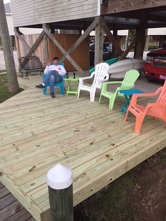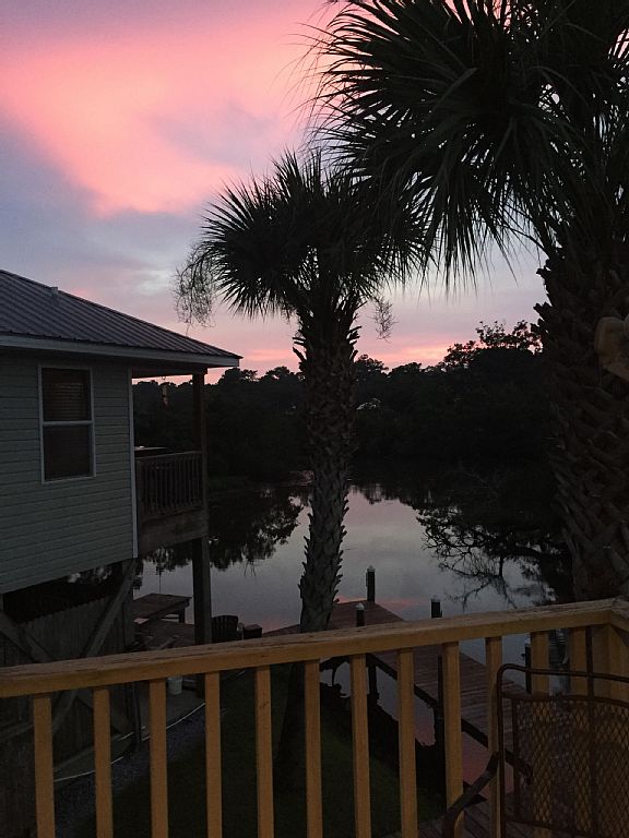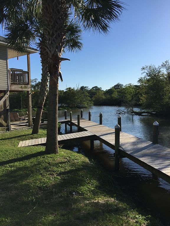 This idyllic cabin, nestled in a community of 18 individual units, features an open floor plan with 2 bedrooms and 1-1/2 baths. The master has a queen bed with ensuite 1/2 bath. The 2nd bedroom has 2 twin beds, the living room has a comfortable queen sleeper sofa. Bright decor and amenities are provided with your comfort in mind. There are televisions in both bedrooms, TV and DVD player in the living room and master bedroom. Hi speed internet WIFI is included at no extra cost.Throw some fresh seafood or burgers on the electric grill sitting on the upstairs deck. For a larger crowd, move to the charcoal grill on the concrete pad below where there's enough grill space and seating to serve many guests. Don't be surprised when a friendly neighbor or two stops by to welcome you and share a beverage.The sugar white beaches of Gulf Shores are a quick 10 minutes away and the beautiful Back Country bike/walking trail can be reached in a 15 minute drive.Once you've experienced all the day's activities at the beach, water park, or racetrack, leave the crowds behind and head back to your little piece of serenity. Enjoy the sounds of mullet jumping in the river, herons, egrets, and pelicans passing over head, and view turtles lounging on stumps on the river bank. Walk to the community salt water pool overlooking the beautiful river for a quick dip, or let the kids play all day. Put your boat or kayak in the river from the boat launch located directly beside the cabin. No need to carry or trailer your watercraft long distances with the launch just steps from your door. If you're lucky you just might get the opportunity to watch dolphins play in the river right next to your kayak! Don't have a kayak? No problem, we have 2 available for you to enjoy! We are close to the beach, but far from the crowds.The best vacation hideaway that will make you want to come back again and again!PLEASE NOTE:-Pets may be considered. Contact owner for details.-Check in is 4:00PM FIRM-Check out is 10:00AM FIRM-Absolutely NO smoking inside the cabin. If you smoke in the cabin you will lose your security deposit.-Three night minimum during the Spring and Summer seasons as well as holidays.-5 person maximum unless you have spoken to the owner and made other arrangements. Exceeding maximum agreed upon occupancy will result in eviction and forfeiture of deposit. Please speak to the owner for any questions or exceptions. More details