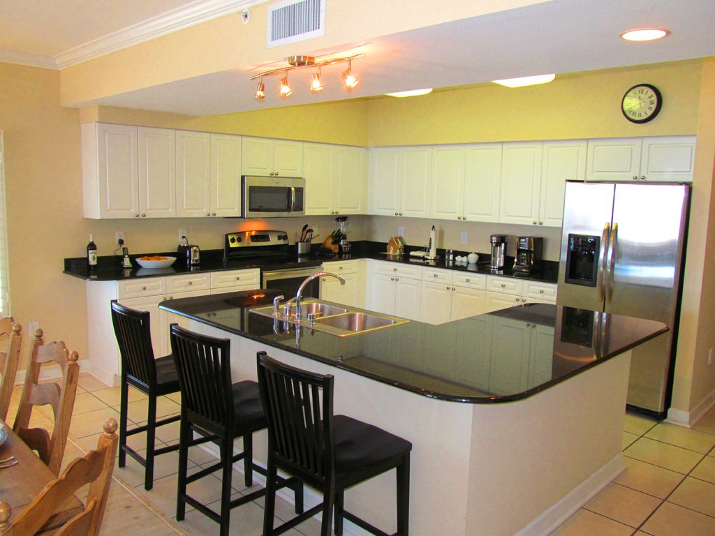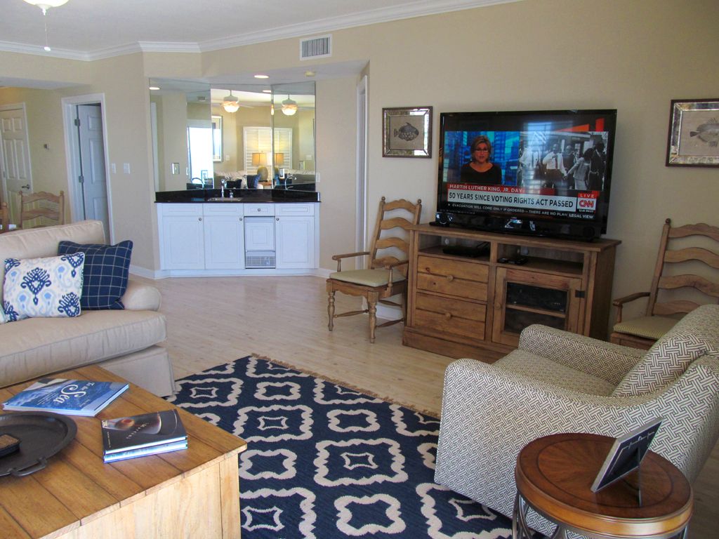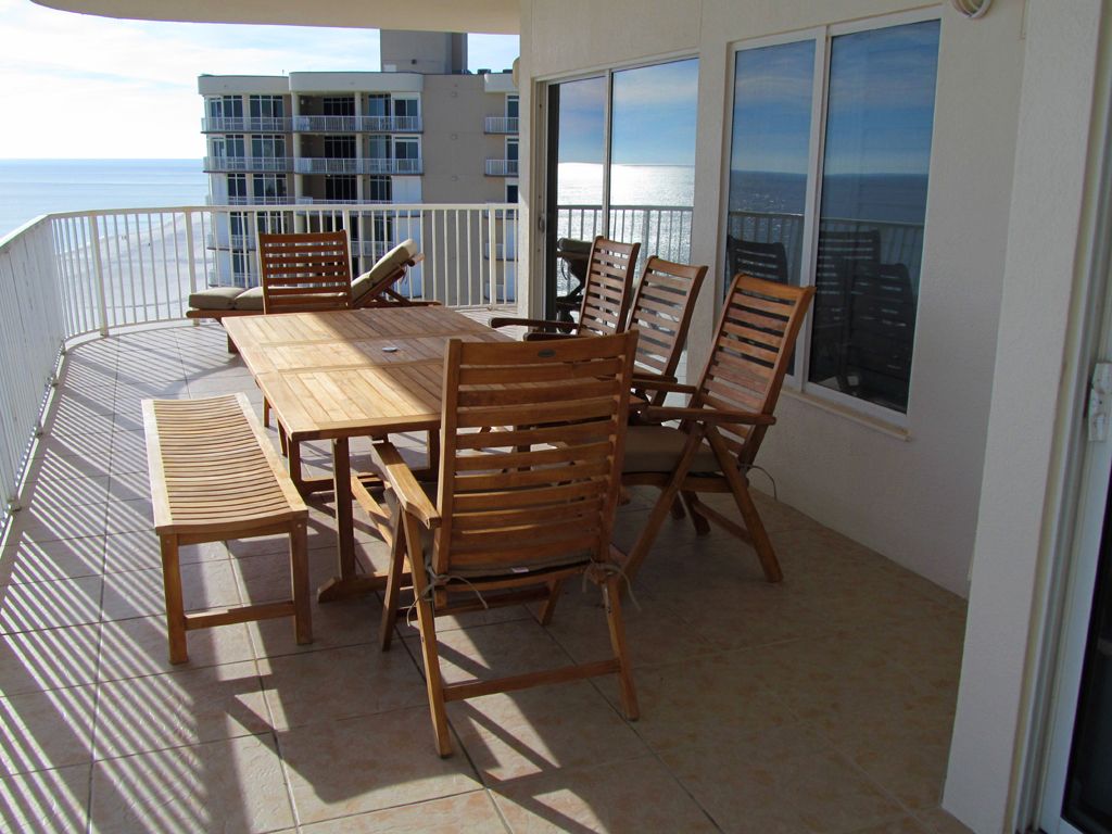 This large 4 bedroom 4 bath Gulf Front corner unit in a low density condominium complex has been professionally decorated in a coastal theme. It can sleep 12 people with 2 King beds, a Queen bed, 2 sets of bunk beds and a Queen Sleeper sofa.The condo was renovated and decorated with all new furniture in 2015 and features solid hardwood furniture in the living area, dining room and bedrooms. At the same time, new appliances were installed as well as new wood flooring with a whitewashed pine finish in the living and dining areas as well as all bedrooms. In addition, there are 5 Smart HDTV units that are Wi-Fi connected so you can enjoy any Internet based TV and music services that you have at home. There is also a Yamaha stereo receiver and 2 new Polk Audio floor speakers.The views from this unit are exceptional. You can relax on the large balcony in the new reclining teak dining chairs or on the teak chaise lounger. The teak balcony dining table seats 8. There are 5 reclining chairs and a bench that seats 3. The Living Area has 2 new sofas covered in Sunbrella fabric for comfort and durability. One is a queen sleeper. It also has a Lazy Boy motion chair that is incredibly comfortable. This area is perfect for large families or groups. There is a 55 inch Smart DTV in the living area with a Blue Ray DVD player for your enjoyment.The dining area seats 8 at the large trestle table. There are also 3 counter stools.The kitchen is well stocked with dinnerware, flatware, and cookware. There is a single serve coffee make as well as a traditional coffee maker.The Master bedroom faces the Gulf so you can open the sliding door and hear the surf. It features a king bed with a dresser as well as a Lazy Boy chair. The Master bath features a double vanity, whirlpool bath and separate shower. The Master Bedroom also has a Smart HDTV.The 2nd Master bedroom is in the north end of the unit and has a view of both Cotton Bayou and the Gulf of Mexico from its wraparound balcony. It also has a king bed, dresser, and chair as well as a Smart HDTV. This bedroom also has a private bath.The first guest bedroom has a Queen bed, a chest of drawers and chair and also has a private bath and a Smart HDTV.The 2nd guest bedroom has 2 sets of bunk beds, chest and Smart HDTV. It too has a private bath.There is a large capacity washer and dryer in the laundry room.The complex has a large beautifully landscaped outdoor pool, an indoor pool, a fitness center, a sauna, BBQ Grills and free Wi-Fi throughout the complex. More details