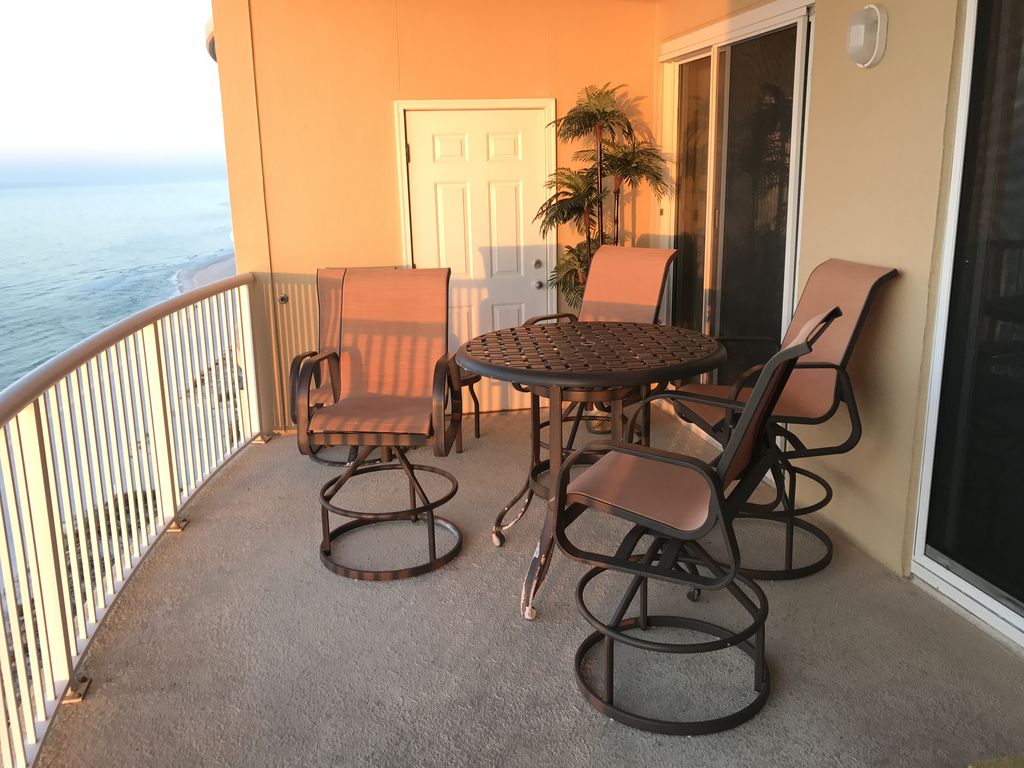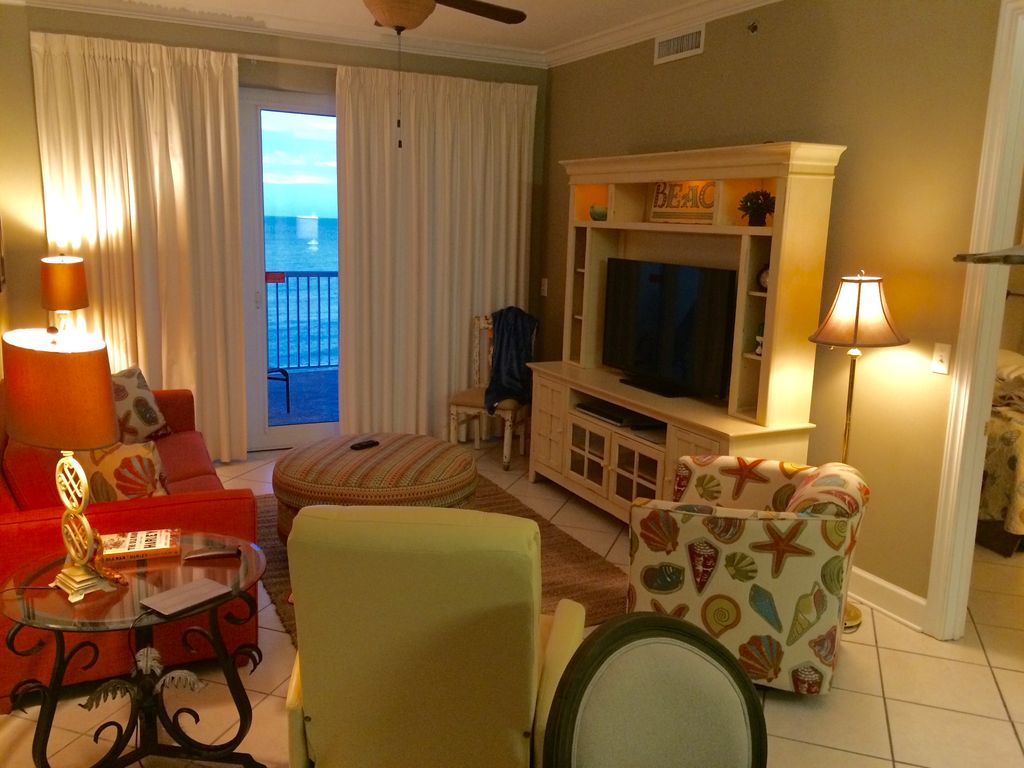 Relax in this fabulous newly refurbished gulf front condo and have all the comforts you need or want. Enjoy the spectacular views including breathtaking sunrises and sunsets on the Gulf from the large curved completely private balcony. Dolphins can be seen most mornings and pelicans and cranes grace our piece of the sky view flying right by balcony with their morning catch. Beautifully furnished penthouse unit! 2BR 2 BA with sleeper sofa will sleep 6. Condo was refurbished September, 2015, with bright coral, yellow, aqua and green beachy fun furniture in the living room along with a new dining table and chairs. New prints and canvasses accent these pieces and make you feel you are truly at the beach. The condo has been freshly painted and has tile throughout. We are centrally located and close to anything you might want to do at all the attractions and eateries. It is the perfect place to stay and enjoy the wondrous views the Gulf gives us!* Keyless entry with your own code for stay. Share with your guests and never have to worry about keys. * Reserved parking space in covered area conveniently near elevator so you can enjoy your car being parked in the shade on those hot vacation days. Space is only feet to boardwalk to beach. Easily store your chairs every night.* Large curved balcony with panoramic view of the gulf and sugar white sands.* Walk to the Hangout, Bahama Bobs, Bill's by the beach, Pink Pony. SOS seafood cooked or raw to go for you to cook, shopping, and other restaurants.* Only steps to the sand! Uncrowded beach for this 83 unit condo building with 300 ft beach area* Upscale furnishings, 9ft ceilings and crown molding, granite countertops in kitchen* Swim through indoor/outdoor heated pools, sauna, indoor and outdoor heated hot tubs, BBQ area, fitness room, sauna and steam room.* Free Wi-Fi and cable with televisions in living area and both bedrooms with dvds* Full size washer and dryer in a walk in laundry room with iron and ironing board* Pier 33 Convenience store located across the street with most anything you might need* Ike's Beach Rentals also across the street for loungers w/umbrellas for rent as well as kayaks, etc* Bicycle racks and bike rental available.* Two elevators for easy access to and from our floor with carts available to get your luggage, groceries etc to our door* Card room/Conference roomOur condo has a fully stocked kitchen with everything you could need including microwave, toaster, blender, coffee pot and dishwasher. Our guests always comment on all the "gadgetry" they find to prepare any meals they want so as to dine in and relax. Dining table seats four and three new bar stools have been ordered to complete the bar seating or enjoy your coffee on your private balcony. Relax in the living area with plenty of seating and just listen to that surf through open doors! Master bedroom also opens out onto the large balcony and has a king sized bed and private bath. Second bedroom has twin beds and adjoining bathroom. There is plenty of entertainment for the whole family when not relaxing on the beach including a water park, putt putt golf, go carts and an arcade center. Zip lining, laser tag, mini golf, go carts, a zoo and of course several beautiful golf courses. Outlet mall shopping is nearby also. We also keep cards and puzzles to entertain.We want you to make yourself at home and enjoy your vacation and be sure to come back!We will give you all the information we can to make your trip excellent. We are the owners of this condo and strive to provide a clean comfortable place to spend your vacation. I am available at all times by phone or text if you have any questions or problems.Note: No pets allowed. No smoking In condo or on balcony. Must be over 25 years of age. Rent to adults and families only. No student rentals.**See our near beach house rental #729568 VRBO** Golf course rental 3Bd/2Ba #962153 VRBO More details