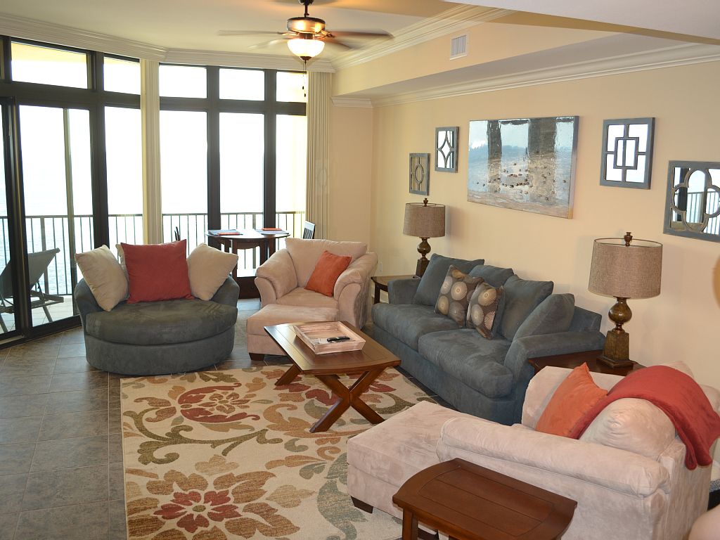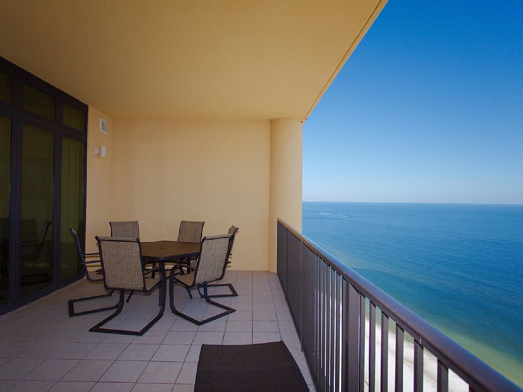 This beachfront unit in the newest development in Orange Beach sleeps 10. Master suite with King-size bed, large flat screen TV, Blu-Ray DVD w/ Smart features (Netflix) Large walk-in closets, Jacuzzi tub and stand up shower, w/ double vanity. Second Bedroom has two queen beds and has a large flat screen TV, DVD Blue-Ray with Smart features as well as private bath with shower/tub combination. Third Bedroom has a King-size bed, large TV, Blue-Ray DVD player with Smart feature. private bath with Shower/tub combination. All beds are plush and have memory foam pillows.Queen sized Sofa Sleeper in the Living Room.Additional Full Bath in the hall - complete with shower.Full Laundry room- with Washer/dryer ironing board/iron. Unit has a wet bar with ice machine, variety of glasses and a blender. Living room set up with sofa sleeper, two large chairs with ottomans, and a round day chair that swivels. Furniture is very comfortable, perfect for laying around after day on beach.Dining room, set up with six chairs and beautiful table, additional seating at kitchen counter (bar) with three additional stools. Kitchen is fully equipment with modern appliances: Stove, microwave, dishwasher, garbage disposal, refrigerator, coffee pot, dishes, silverware, pots, crock-pot, and large Stainless Steel refrigerator. Patio- beautiful view of blue water, and white sandy beaches, patio furniture includes table, six chairs and chaise lounge chair.Unit is clean, comfortable, and casual. More details