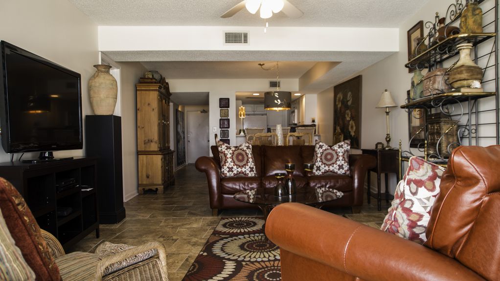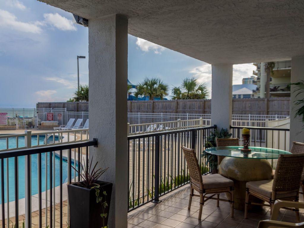 Direct gulf front view just steps to the pool and beach. When you walk through the front door, you have a panoramic view of the beautiful water and white sandy beach of the Gulf! Enjoy a large patio and ground floor access to the beach, pool, grills and parking. The living room boasts floor-to-ceiling windows facing the Gulf.This spacious, newly redecorated 1200sqft 2 bdr 2 bth condo has a large 12'x28' dining/living area! Each bedroom has now been redecorated to include 2 queen beds in the master and 1 king bed in the second bedroom. Each bedroom has its own en-suite bathroom. The master bedroom shares the same view as the living room, with Gulf views to greet you first thing in the morning from the large patio doors.Private pool-side patio is 10'x28'. Privacy walls screen from other guests, bringing the sounds of the Gulf right to you.Parking is plenty and easily accessible to the condo. No check in desk. You can arrive right into the condo. This condo is perfect for the whole family! Sleeps 6 comfortably in beds. As you can see in my reviews, my guests love staying in my home away from home. Please call me directly - 501-679-3363 More details