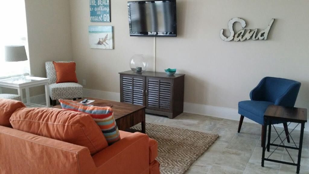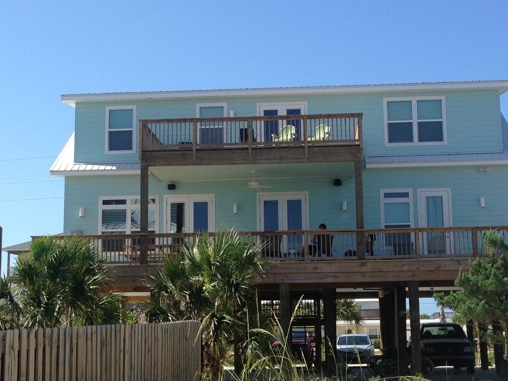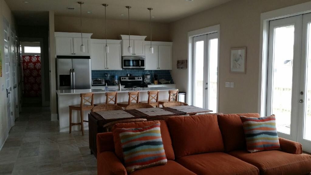 A brand new Pensacola Beach home that looks like it belongs in a magazine. Barefoot Beach House was completed in 2015 and has a total of 6 bedrooms and 5 bathrooms, sleeping a total of 19, all in fabulous beach style.The main floor is very spacious and you know when you enter the open living area that it is something special. The entire floor is covered in large, natural tile which gives the entire Suite 1 a clean coastal look. The modern kitchen, dining and living area all open up to the best feature: the large deck. You can enjoy the view of Pensacola Sound while sitting at a picnic table or other lounge chairs. From the deck you can also see the private walkway that leads to your own private dock. Keep an eye out for dolphins because they like to swim and play nearby. Three bedrooms and two bathrooms are grouped together on one side of the floor plan, which include 2 queens and a bunk bed. On the other side of the suite is a king size bedroom with it's own bathroom. The living room has queen size sleeper sofa and plenty of comfy chairs to relax with company. The dining table seats 8 and is right next to the beachy, white quartz, center island which seats 6. Washer and dryer are conveniently located in open living area. Up the beautiful wood stairs you will find two more bedrooms and two full bathrooms. From the living room guests can see the Gulf of Mexico and the Sound - amazing! The upstairs has an open living area with same beach style as main floor. It has a small fridge, coffee maker, sink and white quartz countertop and center island with 4 barstools. One bedroom has King size bed with private bathroom, while other bedroom has bunkroom that sleeps 4. Another full bathroom can be found off of living area along with washer/dryer. The upstairs also features a dining table with seating for 4 and couch opens for additional sleeping. More details