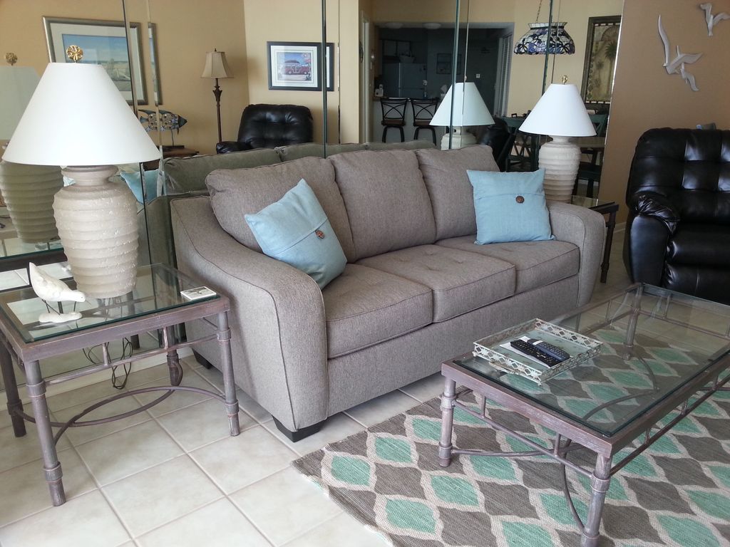 Pelican pointe is centrally located in orange beach on the beautiful white sandy beaches of the gulf of mexico. Pelican pointe is conveniently located to shopping, restaurants and many activities. This 3 bedroom, 2 bath unit has the ability to sleep 8. The master bedroom has a king bed, private bathroom and direct access to the balcony. The second bedroom offers a queen bed and the third bedroom has two twin beds. All bedrooms have flat screen TV's and DVD players. There is a queen-size sofa/sleeper in the living area. New granite counter tops in the kitchen and both bathrooms. The kitchen is fully equipped including microwave, stove/oven, dishwasher, disposal and refrigerator with ice maker. We do an inventory regularly to make sure all kitchen items are what you would expect. Toaster, coffee maker, crock pot and all dishes, silverware and utensils are what you would find in your own home. A full sized washer and dryer is conveniently located near the kitchen. There is a convenient snack bar area with two stools. The dining area has a full sized table with six chairs. The unit is tiled throughout except for the bedrooms which were recently re-carpeted. The exceptionally large balcony is equipped with table, seven chairs and two chaise lounges overlooking the gulf. Other amenities: free high speed internet, large outdoor pool, kiddie pool, heated indoor pool with hot tube and workout room. Lighted tennis court, basketball goal and outdoor grill area. Important to note: pelican pointe has a gated entry and walking surveillance of the property regularly. This is a non smoking and pet free rental.