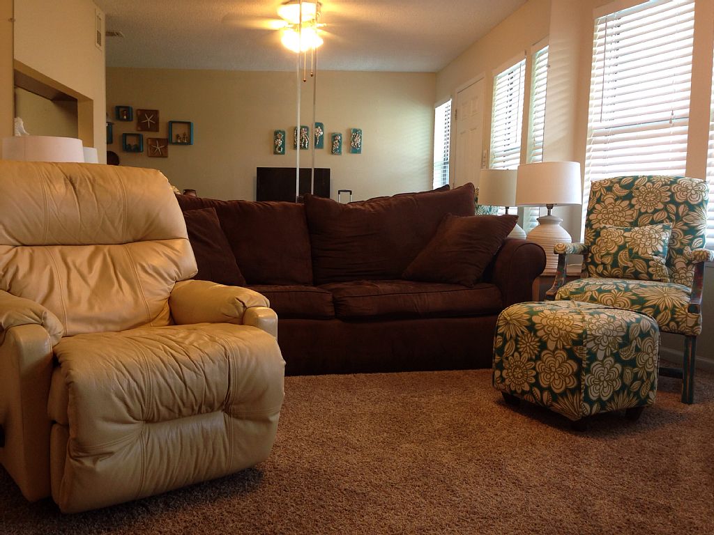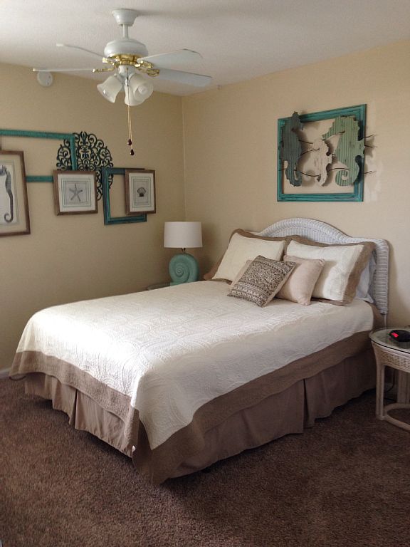 This beach condominium is affordable and relaxing. The condo is not beach front but you can see the beach in the distance and smell the ocean breeze from the front door. The condo sleeps 5-6, the master bedroom has a queen bed and its own bathroom. The guest room has a bunk bed with a double bed on the bottom and a twin bed on top, there is also an extra roll-away bed with twin mattress under the bottom bunk. The minimum age to rent is 25. The condo is across the street from the beach about one hundred yards away. We have deeded beach access with our neighbors across the street. It will lead you to the beautiful white sandy beaches and emerald green water which Gulf Shores is famous for! From the bedrooms there are views of little lagoon.The condo is located one mile from the center of Gulf Shores and minutes from everything Gulf Shores has to offer: water park, golfing, deep-sea fishing marina, shopping at the Tanger outlet-mall, etc. The kitchen is complete with a dishwasher, full size oven, refrigerator, microwave, and a washer and dryer for your convenience. WiFi internet access is here for your use, at no charge to you. There are flat screen TV's in every bedroom with DISH cable. One the property grounds there are 4 charcoal grills surrounding a large shaded gazebo with patio tables and benches, perfect for family gatherings. The large circular pool and gazebo are the focal points of the complex courtyard. Our condo comes with one reserved parking spot. If you have two cars there are unreserved parking spaces but they are limited. Keywords: 2 bedroom / 2 bathroom beach condo More details