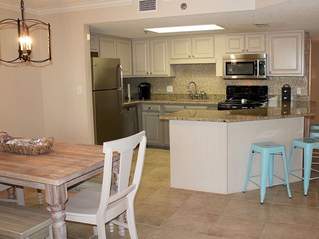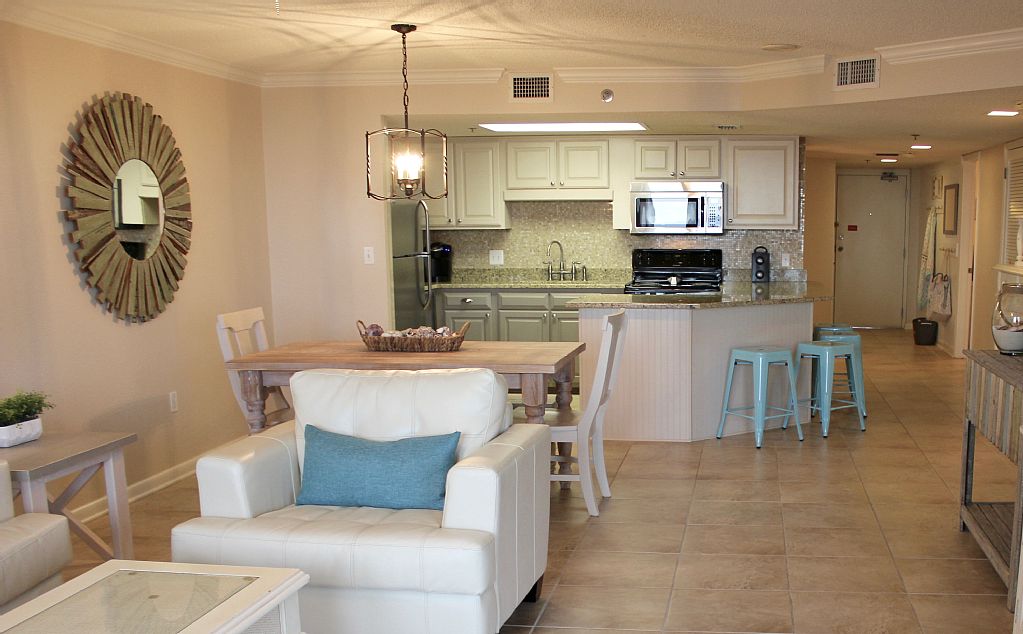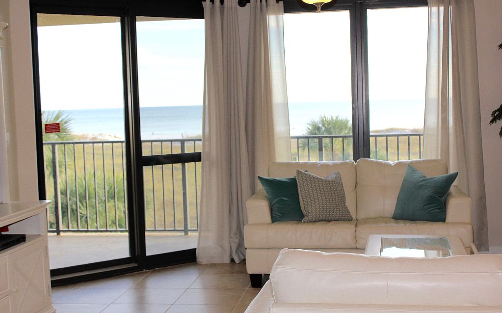 ** New to the rental market!!! We've thought of everything to make this a comfortable home away from home!**We invite you to come and relax in our newly renovated condo directly on the Gulf. The open floor plan gives you a beautiful view of the ocean throughout this condo! Watch the sun rise and set as you listen to the relaxing sounds of the ocean from our spacious beach front balcony. This is also a great place for dolphin watching! Conveniently located on the 2nd floor, our property allows for easy access to the beach, parking, and all complex amenities.Our unit is professionally decorated with updated furnishings throughout. There is a large 50" flat screen LED smart TV with DVD player in the living room. Log into your own Netflix account for movie nights with our complimentary Wifi, or watch your favorite sports team & programs on Dish Satellite. The living room also has a queen size sleeper sofa.The kitchen has brand new stainless steel appliances and is stocked with all the conveniences of home. In case you choose to dine-in, we have done our best to provide everything you could want or need to prepare your meal. In addition to the standard coffee maker, we have provided a Keurig coffee maker to get your day started. There is also a blender to make those perfect beach frozen drinks or milk shakes. In addition, we have provided a slow cooker so you can have dinner cooking while you are at the beach... one of our favorite things to do! The dining room table comfortably seats six with additional seating for 4 at the kitchen bar.There is a full size washer and dryer for your convenience in the laundry room located just off the kitchen, so there is no need to pack your entire wardrobe!The condo comfortably sleeps 8 to 10. The master bedroom has a brand new Cool Gel Foam mattress topper with comfortable pillows and soft blanket. There is no doubt you will be well rested to start your day! There is also a 32" flat screen TV for your enjoyment. The master has sliding glass doors that lead to the balcony with a breathtaking beach view. The master on-suite bathroom has a large vanity separated from the tub/shower.The two guest rooms are furnished with comfortable mattresses as well. One bedroom has a king bed with a separate door to the full bathroom. The other guest room has 2 queen beds and is located across the hall from the bathroom. We know there are many great choices for you when choosing your vacation rental. Please know that we will do everything to make sure you enjoy your stay at our home away from home! Phoenix 6 Resort Amenities:• Beachfront Outdoor Swimming Pool with water fountain• Kiddie Pool • Heated Indoor Swimming Pool with 3 Hot Tubs• Outdoor Barbeque Grills and Gazebos• Lighted Tennis Courts and Half Court Basketball Courts• Indoor A/C Racquetball Court• State-of-the-Art Fitness Center with Exercise Equipment and Sauna• Large Lounge Area with TV and Coffee always available• Meeting Rooms (family gatherings)• Free Wi-Fi throughout condos and in the lobby• Gated Parking• SecurityAdditional Details:This is a Non-Smoking Property. Monthly rentals available in December, January and February. Must be 25 years old.Our condo is located close to grocery shopping, wonderful restaurants, amusement parks, souvenir shopping, walking/bike trails in the State Park, and boat launches for boating in the bay and/or gulf.Local Shopping:Tanger Outlets with over 175 stores & shopsPelican Pointe Shoppes with Target and Bed Bath & Beyond More details