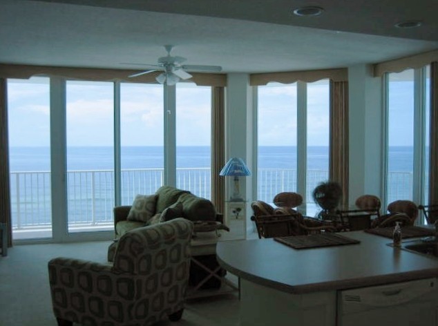 Thank you for considering our beach front condo. You will not be disappointed if you choose us. My family keeps this condo as neat and clean as our own home. And, because we use this property as our second home when we vacation, we keep it in new condition for your maximum enjoyment. We have many repeat customers who stay with us year after year. We hope you chose us for your next beach vacation. *******************************************************************Most all beach front condos only have a master bedroom with a beach view, but this bigger corner condo has the master bedroom and a guest bedroom and the entire living and dining area opening up onto the huge wrap around balcony directly on the beach! Three big sliding glass doors open up an entire wall of glass for the best views possible. No other units compare!* BIG WEST END CORNER UNIT, WITH THAT HUGE WRAP AROUND BALCONY!* TWO BEDROOMS DIRECTLY ON THE BEACH! * LARGEST 3 BEDROOM WITH 3 BATHROOMS IN THE BUILDING! * WALL OF GLASS! ENTIRE BEACH WALL HAS FLOOR-TO CEILING GLASS.* LARGEST BALCONY ON THE BEACH! ALMOST 600SF OF BALCONY.* FLAT SCREEN TV'S WITH DVD AND VHS PLAYERS IN ALL ROOMS.* WI-FI NETWORK WITH HI-SPEED INTERNET ACCESS IN EVERY ROOM AND ON BALCONY.* BIG KITCHEN FULLY FURNISHED, WALK-IN CLOSET, HUGE MASTER BATH DRESSING/VANITY AREA.* EACH BEDROOM HAS A PRIVATE BATHROOM FOR ADDED PRIVACYEver wish you could find the perfect Vacation Condo? This could be it! A superior designed Beach Condo for your maximum enjoyment! Most Beach Condos are a square box. These type condos have only a bedroom, and living room open onto the balcony, any additional bedrooms are over the parking lot with no beach view. You shouldn't come all the way to the beach to look at a parking lot! This three bedroom, three bathroom condo is an end unit with an extra wide floorplan and a majestic wrap around balcony for complete panoramic views of the beach, pools, ocean and magnificent sunsets! This end unit is not a square box, but a long, wider condo stretched along the beach! No more drawing straws to see who gets the bedroom on the beachside, there are two bedrooms beachside with this unit. And your Condo is decorated in a lively Beachy, Island look.Full floor to ceiling glass running the entire length of the wall in the living and dining room, master bedroom and a guest bedroom. Each bedroom has it's own private bathroom with separate vanity/mirror dressing area. The luxury master bedroom and bath has a double vanity/full mirrored dressing area w/walk-in closet and a whirlpool tub! All the luxuries of home!From this spacious condo and balcony you are directly on the most beautiful beaches around! Wake up to a cup of coffee on your oversized balcony and watch the Dolphins play as the boats and parasails go by. There is ample seating for the whole family outside so everyone can view the alluring water of the Gulf. Also, there are three pools, two outdoor(one kid friendly zero entry pool)and a heated indoor pool, two jacuzzis, and a great exercise room overlooking the Beach. At night, you can see the city lights of Gulf Shores because of the huge wrap around balcony! YOU GET IT ALL!And many people think this seventh floor unit is just the right level as you walk in the front door you see a sprawling view of the water and beaches through floor to ceiling glass along the Beachside wall - Nothing but glass!! Wow! On some higher floors, when sitting down you only see the horizon, not the beautiful beach and water as you do in this Condo. On some lower floors, you can be too low, and hear the pool noise and not get the panoramic view of the Beach and Gulf. You will not regret your time in this beautiful decorated beach home. It is where my family and I will also get away for those relaxing moments that make lifetime memories.Also, surf the Internet with your computer from any room or on your balcony overlooking the beach with our Free High Speed Internet Service. Just turn on your compatible notebook computer and the wireless router provides instant internet connection. Our family uses VRBO in our travels and cleanliness is a must, and always a big concern with us. We give this a top priority and my personal housekeeper also cleans our condo as I live in the area. Both Cathy and I are avaliable personally if anyhtng should need attention. We pride ourselves on making your vacation the best ever, and want you back with us in the future.Keywords: Luxury Beachfront Condominium More details