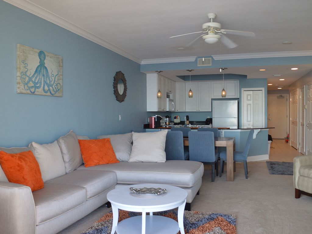 Upscale newly renovated 3BD / 3BA beachfront condo and enough sleeping arrangements for up to 8 guests to spread out comfortably throughout an impressive 1500 square feet of living space, making it ideal for a family, two families or a group of close friends looking for the ultimate beach vacation.This perfectly located spacious luxury condo is within walking distance to at least 8 restaurants (including the Pink Pony, The Hangout, Sea-n-Suds, Pancake House and Waffle House), shopping, the State park fishing pier and more. As you enter the condo you will feel right at home with the upscale coastal decor, updated furnishings along with many personal touches to make your stay memorable. Expansive floor to ceiling windows allow you to enjoy the breathtaking views of the gulf and white sand beaches. This condo has everything you will need for a comfortable stay, including free wireless internet access, four flat screen TVs (all with streaming video ability), cable and DVD players in the living room and master bedroom - sure to satisfy all your entertainment needs during your vacation. Or if you want to disconnect, we also have a selection of family friendly board games, puzzles, children's and adult beach reads and magazines. Why face a wall when you have an amazing opportunity to look directly out to the gulf. We have always wondered why owners place their beds on walls that face other walls when the master bedroom has an amazing view of the gulf so we didn't do that....we placed the bed to take advantage of the gorgeous gulf views right from bed through the floor to ceiling windows.... a king size bed, flat screen TV with DVD and streaming video, a master bath with double sinks, jacuzzi tub (in case you want a little spa time to end the day) and a walk in shower. The second bedroom also has a king bed with access to the guest bathroom from the bedroom and a flat screen smart tv. The third bedroom is perfect for those young at heart......twin over full bunk bed with mounted flat screen smart TV and its own bathroom. Another portable twin bed can be set up in the condo for additional sleeping .If you want to go out and relax on the over 250 sq ft balcony, no worries there is plenty of room ....we have two lounge chairs, two adirondack chairs and dining table if you want to relax and enjoy the views and have your morning coffee, evening beverages or meals.Super comfortable living room area with a brand new sectional sofa to relax and unwind watching TV or just taking in the views from the chaise lounge. Living area has flat screen TV, DVD player with streaming video, BOSE stereo with auxillary hookup for your music sources and family board games. A wet bar is off the living / dining area for all your beverages and snacks. For those meals you may want to cook, the kitchen is fully stocked with brand new cookware, small appliances and Keurig coffee maker (regular style coffee pot also in unit) along with a crock pot for those super easy meals. If you have the need to do laundry the unit is equipped with a full size washer and dryer.Traveling with young ones.....don't stress about packing it all....we have a pack-n-play, high chair and walker along with sand toys!!! The complex amenities include large pool with beach entry, sauna, fitness room with cardio and weight machines that look out to the beach and pool. The complex provides covered parking along with regular parking lot spots and an overflow parking lot during peak weekends.We live locally so if you have any questions or would like any referrals, don't hesitate to ask....we love sharing our tips to make your vacation even better. Want to have a special dinner, photographer to take professional photos....whatever it may be we can probably help. More details