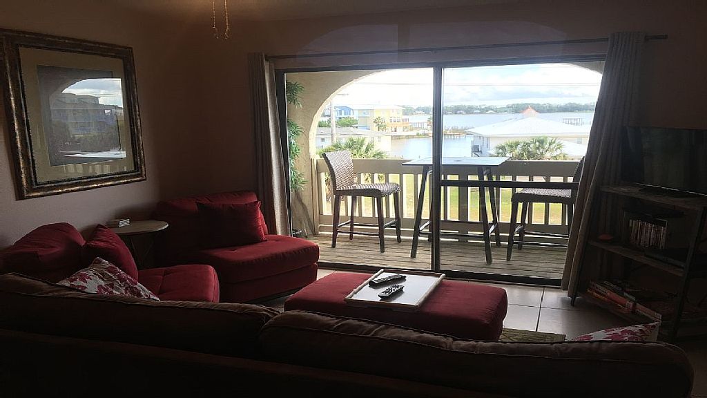 2 bedroom/2 bathroom condo that sleeps 8. Beautiful top floor unit on the corner with a direct view of the lagoon from your balcony and an indirect beach view from the front deck. The complex has 2 pools, a grilling area, and 2 spaces of covered parking with laundry facilities on site. Unit has been remodeled with everything to make your vacation complete, 3 flat screen TV's, 3 DVD players, cable/internet, and a fully equipped kitchen. Quiet location right across the street from the beach, only 1 mile from the Hangout and next to a convenience store. Great location close to shops and restaurants. If you are looking for a vacation on a budget with a great view and location this is it! Recent owner was rated "frequently booked" on VBRO.