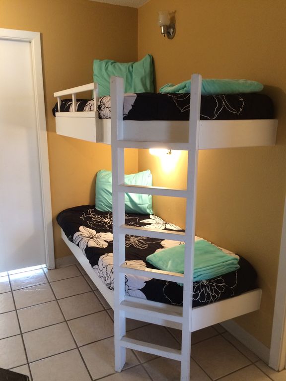 *****Recently Renovated*****New cabinets, granite countertops, built in microwave, tile backsplash in kitchen, new tub and tile shower surround, ceiling fan in great room and bedroom, new sleeper sofa and new bedroom furniture.All Emerald Skye units offer direct gulf view, private balcony, outdoor seasonally heated pool, bar-b-que grills, & beautiful white sand. If watching from the balcony dolphins can be seen feeding daily. The lighted private pier next door, although not accessible to Emerald Skye guests, provides a spectacular view of the ocean waves all night. This unit features 2 32” flat screen TVs (one wall mounted in master bedroom),a queen size sleeper sofa, large bath vanity, queen bed, top bunk with safety rail, comfortable recliner in living room. Bunk area can be closed off from living room and bedroom for privacy. You have use of elevator & luggage carts but not necessary to wait for elevator since this unit is only one floor above ground level. Great central Orange Beach location near restaurants, fishing, parks, shopping, marinas and the world famous Flora-Bama. To the east it's a 30 minute drive to Pensacola, Florida where you may visit the Naval Air Station (home of the Blue Angels) and the Naval Flight Museum. To the west it's a 1 hour drive to Mobile Bay where the USS Alabama is docked. A short drive west from Mobile are the Biloxi Casinos. The photos depict only a few of the many family oriented attractions near the condo. This is a low density, family friendly complex providing the best quality beach vacation you will find.Keywords: Condominium More details