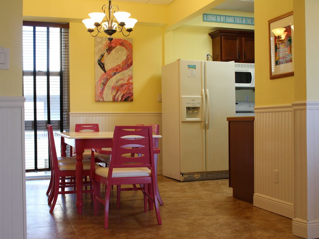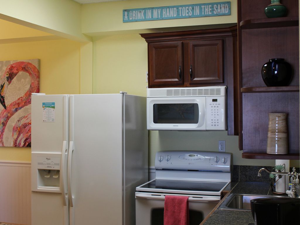 Whether you're just taking in the panoramic views, enjoying the sunrise, or just want the best seats for the Blue Angels' show or 4th of July fireworks, the balcony does not disappoint...and being able to walk across the street to Peg Leg Pete's doesn't hurt either. We have a deeded covered parking space in the garage which is awesome to protect against the Florida heat and rain. Because our condo is on the top floor and where it is located in the building, we don't have neighbors on either side or above us. This unit is quiet. Additionally, the condo has a king bed in one bedroom, and a queen bed and twin daybed with trundle in the other bedroom offering a wide variety of sleeping arrangements for up to six people. Full kitchen with a separate dining area makes meal time easy. Two full bathrooms, one with a walk-in shower, the other with a tub and shower combination. The complex has elevator access on every floor and the condo is all on one level. Our condo is set up to be easy and welcoming and to make sure you have everything you need to enjoy your stay and return home relaxed and with a lifetime of great memories.