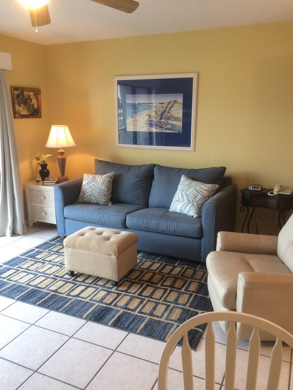 Seaside Beach & Raquet Club is a complex with numerous amenities including 2 large, beachside outdoor pools, heated indoor pool with nearby picnic area, exercise room, sauna, steam room, shuffle board, tennis courts, bar-b-que grilling areas, club house & a guarded security entrance.This unit is located on the 2nd floor of a 3 story building. From this floor you have a nice, wide indirect view of the beautiful white beach from your balcony. It sleeps four with a queen bed in the bedroom & queen sleeper sofa in living room. Recent remodeling includes granite counter tops in kitchen & bath, new cabinets, & some new lighting/plumbing fixtures. You will find a spacious kitchen that is stocked with everything you will need & a pantry for storing food & supplies. The living room & bedroom each have a flat screen TV & free internet is available. There is a stacked laundry near the bath for your convenience. To make acccessing your unit easy, an elevator is located nearby. Seaside Beach & Raquet Club has great central Orange Beach location near restaurants, fishing, parks, shopping, marinas and the world famous Flora-Bama. To the east it's a 30 minute drive to Pensacola, Florida where you may visit the Naval Air Station (home of the Blue Angels) and the Naval Flight Museum. To the west it's a 1 hour drive to Mobile Bay where the USS Alabama is docked. A short drive west from Mobile are the Biloxi Casinos. The photos depict only a few of the many family oriented attractions near the condo. Seaside Beach and Raquet Club is a place for great vacation any season of the year. More details