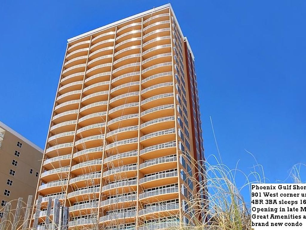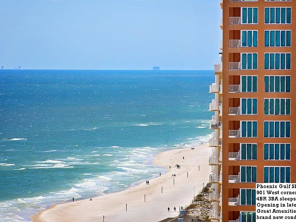 Spectacular, panoramic views of the Gulf, white-sand beaches, sunrises, sunsets and spectacular big sky views are just part of what this beautiful, brand new luxury condo has to offer you!Enjoy luxury accommodations and an exquisite beach front view in this brand new 4 Bedroom corner condo located on the 9th floor of the newest building on the Alabama gulf coast. Available starting mid-May 2017. Unit 901, 9th floor, West corner unit.Sleeping Accommodations:Sleeps 14 in beds and 16 using sleeper sofa. Great for large families, several couples with children, event weeks/weekends, team sporting events, girls beach vacation, and winter guests. Has a toddler/children/teens bedroom that sleeps 6, yes 6 with 2 bunkies with full bed on bottom and twin on top.#1.Master Bedroom King bed, sleeps 2#2. Bedroom: 2 bunk beds (full bottom, twin top), sleeps 6 Great for the Kids and Teens#3. Bedroom: 2 Queen beds, sleeps 4#4. Bedroom: 1 King bed, sleeps 2 #5. Sleeper Sofa: Queen, sleeps 2Total sleeping capacity: 16 Total Bathrooms: 3Features:*The unit contains floor to ceiling windows, 10' ceilings, granite counter tops, stainless steal appliances, wet bar, private balcony, and fully tiled floors. *ADA Wheelchair Accessible , ADA compliant Bathroom with low entrance step (1") into shower.*Whirlpool Bath in Master Bathroom*Dishwasher, Disposal, Microwave, Range-Electric, Refrigerator w/Ice Maker, Washer Dryer.* Large balcony with spectacular panoramic views of the Gulf of Mexico and the pure white-sand beaches of Gulf Shores and of Little Lagoon to the north west! Balcony furnishings include 2 loungers, table for 6, table for 2, additional chairs.*48" Flat screen TVs and Blue-ray player in every bedroom. *Dining table with seating for 8 w/ additional seating for 6 more at the kitchen bar.*Separate wet bar with ice maker.*Large 65" curved screen Samsung smart 4G TV with round sound wireless speakers and Wifi streaming free Netflix w/Blu Ray players in the living room* Free Netfix streaming (can be used on two TV's at one time).*Fully-stocked kitchen (w/very large wrap-around bar) for all your cooking needs.*Beautiful 18X18 tile throughout the condo.*Keyless entry system for guests’ safety and convenience* Free high-speed WiFi.* Several pool/beach towels, folding beach chairs and a couple of umbrellas are provided for our guests' use.*Approximate Living Area: 1875 indoors -295 DeckBeach amenities:As an added PERK, I hope to have a Beach Service front row lounge chairs and umbrella set up daily for my guests (March through Oct.) LOOK for "901" on the lounge chair name board and enjoy!Building amenities:Large zero entry outdoor poolIndoor poolTwo hot tubsSaunaFitness centerTennis CourtMulti-level garage parkingEnclosed climate controlled hallways on all floorsBBQ AreaGated and SecurityElevators: 4 high speed (no or short wait time)Location:The Phoenix Gulf Shores condo is located 0.5 (1/2) mile from the center of Gulf Shores (turn right or to the west where highway 59 meets the Gulf at The Hangout on Beach Blvd).There are many restaurants within walking distance or a short drive from our condo. You can even view the local favorite, Bahama Bobs from our balcony! Other nearby family-fun centers include a water (Waterville) and amusement Park (The Track), a zoo, miniature golf, and go-kart tracks. The Tanger outlet mall is about a 15-20 minute drive from the beach, and there are numerous fishing charters, tennis facilities and world-class golf courses nearby. The Wharf, located in nearby Orange Beach has many shops, restaurants, and an ampi-theater. Short day trips include, Ft. Morgan where you can take the ferry across Mobile Bay to visit the Dauphin Island Estuarium Sea Lab and the Bird Sanctuary and Pensacola, Fl where you can visit the Naval Aviation Museum (home of the world famous Blue Angels).NEED MORE SPACE?I also own and rent a 2BR 2BA beach front condo at Crystal Shores a 5 minute walk west of Phoenix Gulf Shores if you need additional room. See www.vrbo.com/124340 for details.New Returning Guest Appreciation Discount:If you enjoyed your stay, come visit us again. New guests can save 10% off the nightly/weekly rate when you stay a second time at our condo within 12 months. (Not applicable to monthly winter rentals or when combined with other deals or discounts) More details