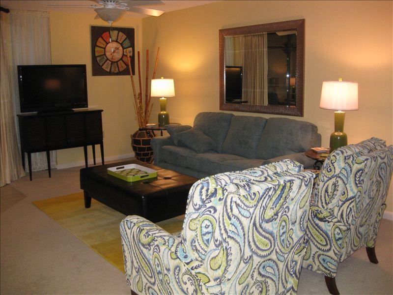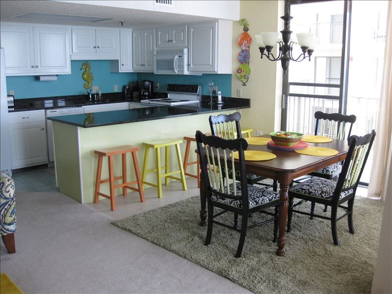 We have completely transformed this condo. It has been painted throughout, has new furniture, bedding, drapes, pictures, kitchen cabinets with granite countertops and new LCD TV's in each room. Guests have told me that the pictures do not do it justice!. This 12th floor east corner unit is very spacious and has a breathtaking gulf front view from the kitchen, living and dining rooms. The living room has a comfortable sleeper sofa, leather ottoman, 2 recliners and a 42' LCD TV. The king suite has its own bath and a private wrap around balcony, the 2nd bedroom has 2 queen beds, and the 3rd bedroom has 2 twin beds. There is a ceiling fan in each bedroom and in the living room.There is a huge wrap-around beachfront balcony that opens from the living room and the dining room. A protective mesh screen has been placed on the balcony railing. The complex has everything to ensure that you have a memorable vacation: indoor and outdoor pools, kiddie pool, hot tubs, saunas, lighted tennis courts, indoor racquetball courts and an exercise room. There are 2 elevators and ample carts and buggies to use for loading and unloading. Imagine yourself, surrounded by friends and family, enjoying a sunrise or sunset from our large, private wrap around beachfront balcony. Watch the dolphins play in the emerald waters of the Gulf of Mexico, enjoy a glass of wine, read a book, or just do nothing at all. Relax - you're on vacation! Keywords: Condo, Beachfront, Resort More details