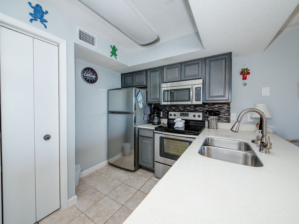 Email, call or text 205 706 2327 for info not shown here.One bedroom w/bunks for the kids.Just remodeled and new on the rental market! Get great rates now.Great balcony with direct view of the Gulf of Mexico.Beautiful pool and hot tub directly below balcony. Gazebo by the pool to get out of the sun. Table, 4 chairs and lounger on the balcony.Our kitchen was just remodeled with new custom cabinets, all new stainless steel appliances, new quartz countertops. Well supplied kitchen. Icemaker in the freezer.Brand new washer dryer. Iron and full size ironing board. New 50" HD SMART TV in the living room. New DVD player and stereo. We have plenty of DVD's for the kids. The living room TV gives you instant access to Netflix, Amazon and lots more that I don't understand. We have Mediacom (HD) enhanced cable with the extra channels.HD TV in the bedroom.We have a local land line.Free WifiGreat furniture including new Tempurpedic mattress in the bedroom. Well decorated unit. Sleeper sofa in the lIving room. Recently remodeled bath with brand new bath/shower. Hair dryer furnished.Ceramic tile in the foyer, bath, and kitchen and new carpet in the living room and bedroom..Grills on property for those that want to cook out. Sorry but no grills allowed on the deck.The two elevators are only steps from the front door.Great restaurants within walking distance.Sorry, we cannot rent to those under 25 without parents.No smoking in the unit please.Sorry, no pets unless service animals (homeowners association rule).If you do not see a length of stay that suits you, call or Email us. We can make exceptions occasionally. More details