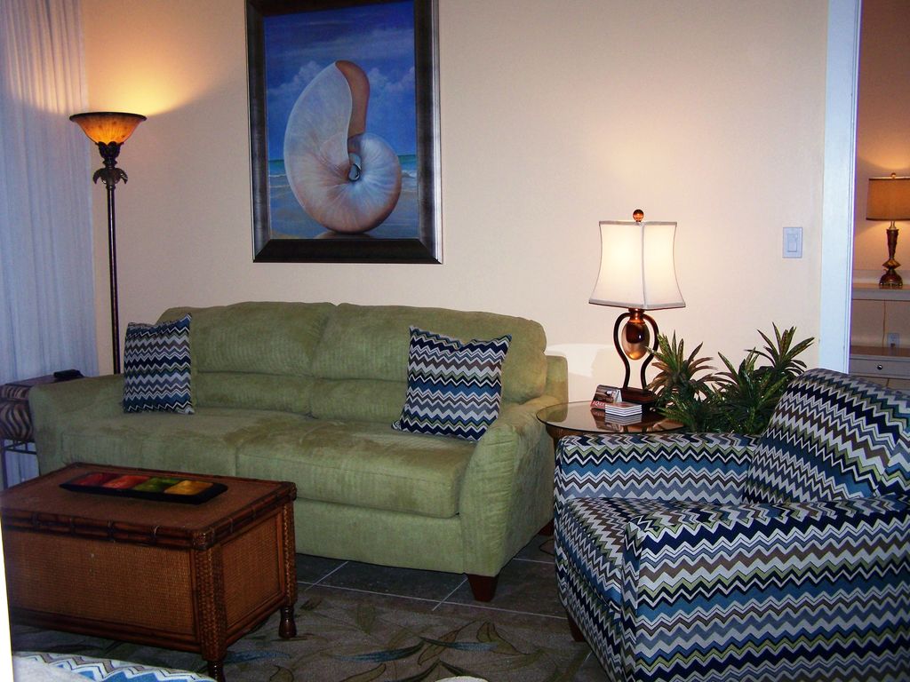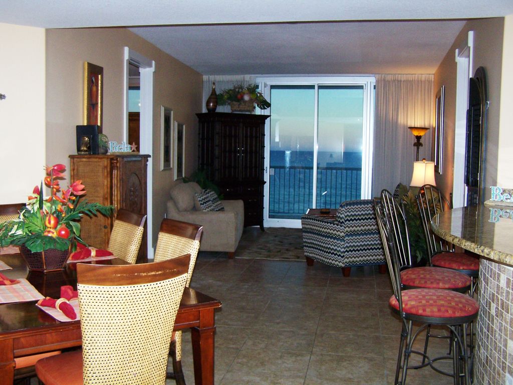 This is a 3 bedroom /3 bath center unit located in the modern luxury condominium complex called Island Tower located directly on the West Beach of Gulf Shores -1/2 mile west of Gulf Shores Pkwy (Hwy 59) on West Beach Blvd. It has a stunning view of the ocean and the white powder beaches of the Gulf of Mexico and all the amenities that one could ask for. Island Tower is centrally located near restaurants, shopping malls, fishing, water parks, amusement parks, golfing and the State Park. It is within walking distance to area restaurants (Bahama Bobs, The Hangout, Desoto’s, an ice cream parlor and others), nightlife (Bahama Bobs, The Hangout and a liquor store) and several souvenir shops. It is 10 minutes from a movie theater, 20 minutes from Outlet mall shopping in Foley and Flora-Bama. Island Tower features:• Indoor heated pool with infinity edge (3rd floor) and floor to ceiling windows that overlook the ocean – unique view looks like you are eye level with the ocean when you’re in the pool • Outdoor Pool with Infinity Edge• Fitness Room (4th floor) with floor to ceiling windows that overlook the ocean and a steam room. • 4 levels of private covered parking• Secuity guard onsite • Barbecue grills on lower level• Walk-out directly to private beach• Chairs/Umbrella on the beach available to rent for $30/day or $135/week• Low density complex, only 3 condos per floorCondo Amenities:This clean and spacious three bedroom, three bathroom condominium (1650 square feet) has been recently remodeled and painted in beach décor and comfortably sleeps 6 adults (8 if using the pull-out sofa). It is located on a very desirable low floor of Island Towers Condominiums that gives you an excellent view of the beach and pool areas. You will be close enough to identify your family and friends at the beach but far enough away from the outdoor pool that noise is not a problem. (In the higher level condos it is harder to identify people on the beach.) This condo is close enough to the pool, fitness center and 4th level parking that you can easily use the stairs instead of relying on the elevator. This is a center unit with large windows that make for a sunny and cheery atmosphere. Each evening you will enjoy fantastic sunsets from the large private balcony.• Living room, master bedroom and second bedroom have floor to ceiling windows and sliding glass doors that lead out to the private balcony and an unobstructed panoramic view of the West Beach of Gulf Shores. All of these windows have sheer and blackout curtains so you can let some light in or block it all out.• The large balcony is very nice to sit out on and has a table with four chairs, a lounger and a side table. It is private so all you see is ocean - not other balconys and some of us have been known to sleep out there! • Master Bedroom and Junior Master Bedroom have King size beds and adjoining bathrooms. Master bathroom is large with double sinks, Jacuzzi tub, walk in shower and large walk in closet.• Third bedroom has Queen size bed and an unconnected bathroom right next to it.• Living room has sleeper sofa for additional sleeping area• This unit has an updated kitchen with granite countertops, smooth top stove, stainless steel side by side refrigerator with ice maker, microwave and a full size pantry for all your grocery needs. Kitchen is fully equipped for cooking. • Dining room table seats six and there are also three bar stools.• The living room and all bedrooms have brand new HD TV's and DVD Players. Masters and living room have BD Wireless Streaming Blu-Ray/DVD players (with access to Netflix, Amazon Instant Video, etc.) and Dish Network satellite service.• Entire condo is tiled floor with rugs. • Full size washer/dryer and utility room• Free High Speed Wi-Fi• No pets or smoking allowedThis condominium is warm, inviting, and very comfortable. We know that you will feel the same way that we do when we stay here. It is our Home-Away-From-Home!Email/Call for discounted last minute rates (arrival within 2 weeks of booking).Keywords: High Rise Condominium, indoor pool, wi-fi, private balcony More details