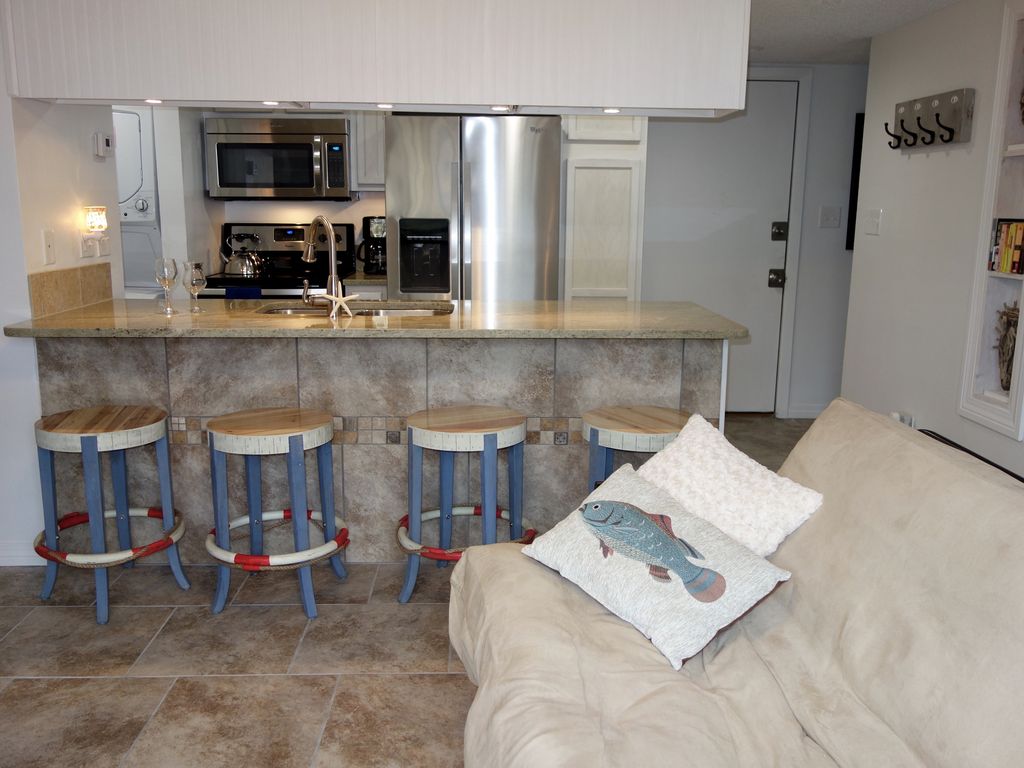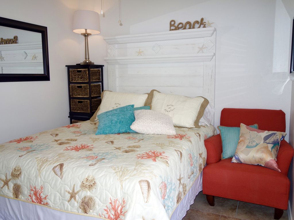 Secrets at Spyglass ocean front condominium. Close to everything that you could want in Gulf Shores. Newly updated 2br/2ba unit. You are steps from the beautiful white sandy beach and the Gulf of Mexico. The complex is an 11 unit building located in two stories, Secrets is a one story unit located in the center of the building.The Spyglass complex offers a beautiful beach-side sundeck with a grill and a fresh water supply to rinse off from your fun day on the beach. There is a cozy shaded swimming pool for the kiddos who need a break from the sunshine. Parking is covered under the unit.Sleeps 5 people comfortable in: 1 queen bed in the master suite, 2 twin beds and a futon (full) in the guest room, and 1 futon (full) in the living room.This unit has all the amenities you need such as a microwave, dishwasher, washer & dryer, oven, refrigerator and a/c.Spyglass is a 11 unit condo complex and one of the few small condominiums left on the beach and Secrets at Spyglass is a unit located in the middle of the building. The Spyglass complex is located on the beach side of the beach boulevard.No high rises to ruin your view.No smoking.No pets.Very close to everything that you could want in a beach community. A short drive to the warf, the hangout, beach shopping, restaurants, beach bars, grocery stores, mini golf, a movie theater, walmart, target and outlet shopping (foley, al). Minimum age rental is 25 years. More details