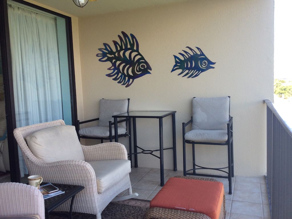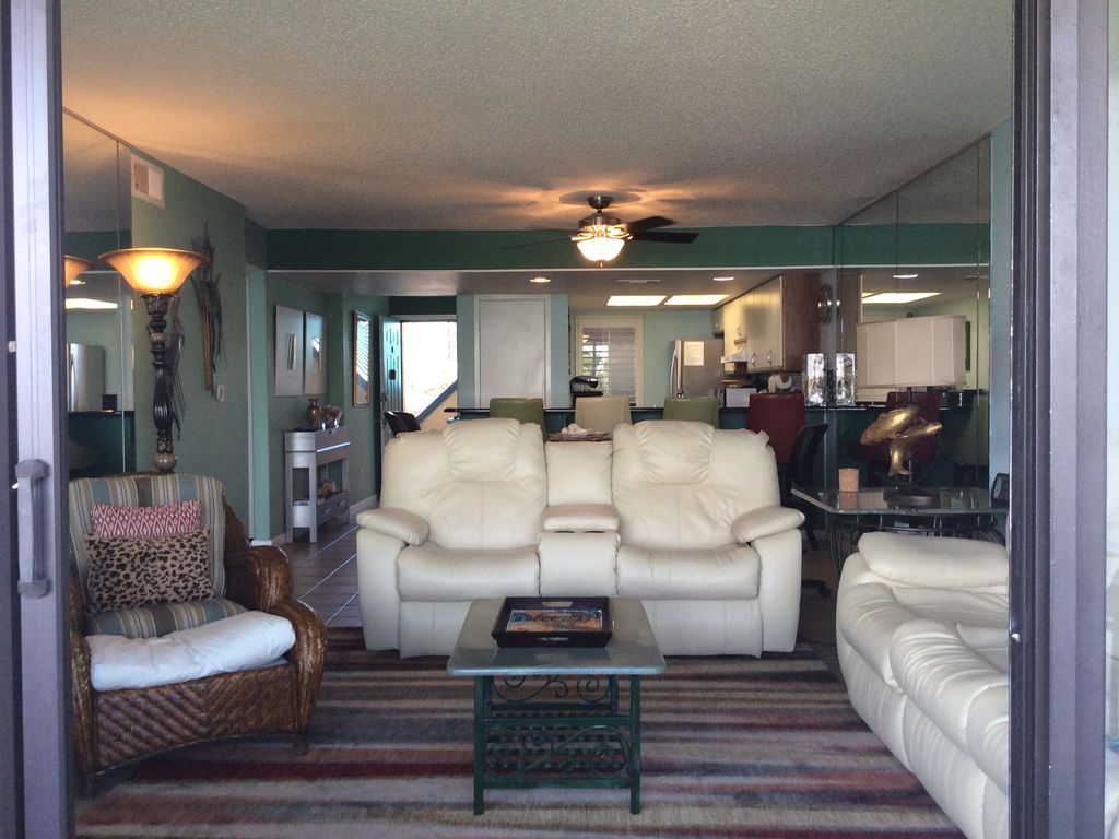 This unit has the best of both worlds: Views of Ole River with boat slips and access to the beach via a safe crosswalk. This is a newly renovated 2 bedroom 2 bath condo with granite counter tops in both the kitchen and bathrooms, ceramic tile throughout the entire condo with area rugs, Electric Reclining Leather Couch and Love Seat and a Large Flat Screen Smart TV. The balcony has two Wicker Rocking Chairs and Ottomans and a High-top Table with two chairs and 4 stack chairs for plenty of seating.