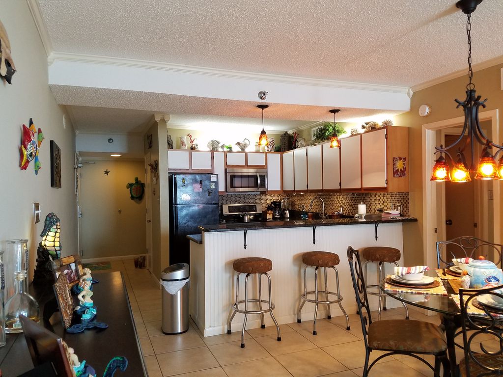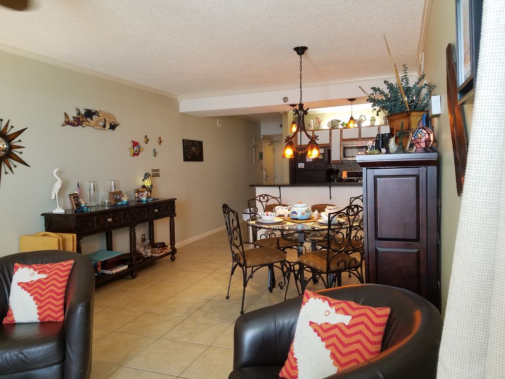 This luxury condominium is beautifully furnished and decorated in a upscale beach motif. The large balcony is accessible from living room, and master bedroom and directly overlooks the beach. Romar Place 702 has a spectacular panoramic view, especially from its 7th floor perch. Pictures are included of the unit. Great room has a large flat screen TV, DVD, CD player with IPOD docking station, Italian leather chairs and a leather sleeper sofa. Glass Top Dining table that seats four with additional seating for 3 at the breakfast bar. Fully-equipped kitchen, including LG stainless steel appliances. The master suite has a King-size BioPedic mattress, 32' wall mount flat screen with DVD player, private bath, and two six by eight feet sliding glass doors leading to the gulf front deck. The second suite has a Queen-size BioPedic mattress, 26' wall mount flat screen with DVD player. The third bedroom has 2 Twin-size BioPedic mattresses, wall mount flat screen TV/DVD, and full bath. Full-size Maytag washer and dryer with iron and board. No hidden charges, just rental, lodging tax and cleaning fee! No last minute charges, NO parking fee, NO departure fee, NO non-refundable processing fee, NO non-refundable application fee, NO service fee, NO towel fee. Lastly, no long lines to wait for a key (keyless entry), and only surprises when you get to your vacation paradise. Le Joie De Vivir is truly 'The Joy of Living'.Keywords: 3 Bedrooms, 2 Baths, NON SMOKING, 7th Floor, Gulf Front Condo, Beach Side Outdoor Pool, Heated Indoor Pool, Sauna, Jacuzzi, Exercise Room, Charcoal Grills More details
