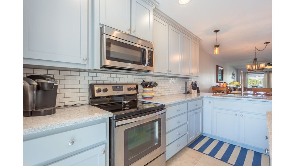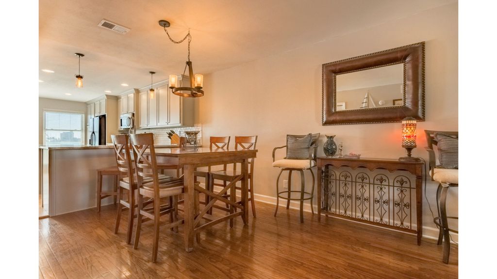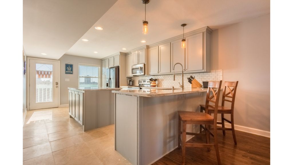 Modern and spacious fully updated 2/2 has room for everyone including the dog! This rare pet friendly Condo welcomes children and pets to explore the property and vacation together. Designed with easy living in mind with a real cooks kitchen with granite counter tops, SS appliances, real hard wood floors throughout, soft leather furniture, flat panel TV’s, WiFi, and very tasteful décor. Step out back to your own private covered patio area and watch the kids play on the grassy lawn adjacent to the community pool or take a stroll along the private pier and go fishing. Sleeping accommodations for a family of six including a large Master bedroom with a king bed and private bath, and a second bedroom with bunk beds and a queen futon. Second guest bath has access from the entire Condo. Pet cages and bedding provided. Casino Beach is one short block away and Pensacola Boardwalk within a 5-minute stroll. Enjoy all the beach activities, restaurants, shopping, nightlife and more, all right outside your front door.