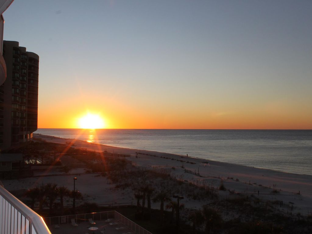 This beautiful luxury condo at Regency Isle is located directly on the beach and sleeps up to six. With its spacious floor plan and oversized balcony you can relax inside or outside. With the large outdoor pool area you never have trouble finding a nice place to lay out and enjoy the day. During the winter months or inclement weather you can enjoy the indoor heated pool area with hot tub, sauna & steam room or work out in the fitness center. This spacious 4th floor, non-smoking unit features two bedrooms, two and half baths and nine foot ceilings. The fully-equipped kitchen with granite countertops, full size appliances, wet bar with sink and ice maker (no more buying bags of ice to fill the cooler)! There is also a walk in laundry room with full size washer and dryer. This unit comes with everything, just like home! The master suite includes a king size bed, flat screen TV, sliding doors to the balcony and a huge bathroom with a jacuzzi tub and separate shower. The guest bedroom includes a queen size bed, flat screen TV and private bathroom. There is sleeper sofa in the living room along with a flat screen TV and DVD player. There is a reserved parking spot in the parking deck & free Wifi. Regency Isle is located in Orange Beach, AL within walking distance of the Florabama. More details