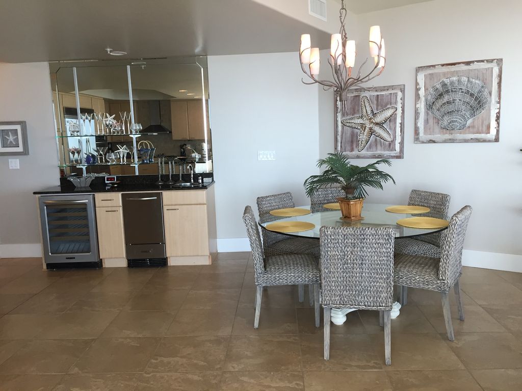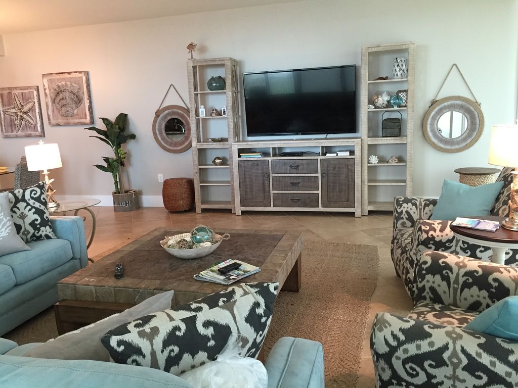 Our newest condo is located in Caribe Resort overlooking the Gulf of Mexico and Old River and Ono Island. We also own 515D. If you need two condos please let us know. The panoramic views from the Living Room speaks for itself. The Living Room is furnished with a sectional Queen Sleeper. There is a 70 inch Flat Screen HD TV, DVD and stereo. There is plenty of seating for everyone to enjoy the view along or watch a Movie at Night.The balcony is furnished with Table and Chairs and Loungers for enjoying the outdoors.The dining has table and chairs with seating for 6. The Breakfast Bar has additional seating for 4. The Wet Bar has both a Wine Chiller and Ice MakerThe Stainless Steel Upgraded Kitchen is fully stocked.The Master Bedroom is furnished with a Comfortable King Bed. There is a Dresser and Large Flat Screen HD TV and DVD. There is a walk in closet. The Master Bath has a jetted Jacuzzi Tub and Separate Glass enclosed shower. The vanity has double sinks The first Guest Bedroom is furnished with 2 Queen Beds, Large Flat Screen TV and DVD. This room also has a private Bath.The second Guest Bedroom is furnished with a Queen Bed. This bedroom has a private Bath. Also Large HD TV and DVDThe third Guest Bedroom is furnished with Bunks. The bottom bunk is a full bed with a trundle underneath and the top bunk is a twin bed. This room sleeps 4. This room is also furnished with Large Flat screen TV and DVD. There is a laundry room with fill size Front Loading Washer and Dryer There is a Half Bath for Drop in GuestsThe Complex has all the amenities you could want. Out Door Pools, River Pool, Indoor Pool, Fitness Center, Sauna, Theater, Grilling Area.There is of course free WiFiThere is also a shuttle to take everyone to the Beach so you don't have to cross the street. More details