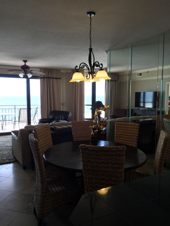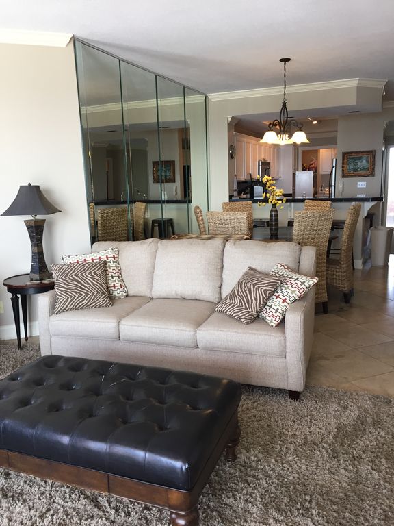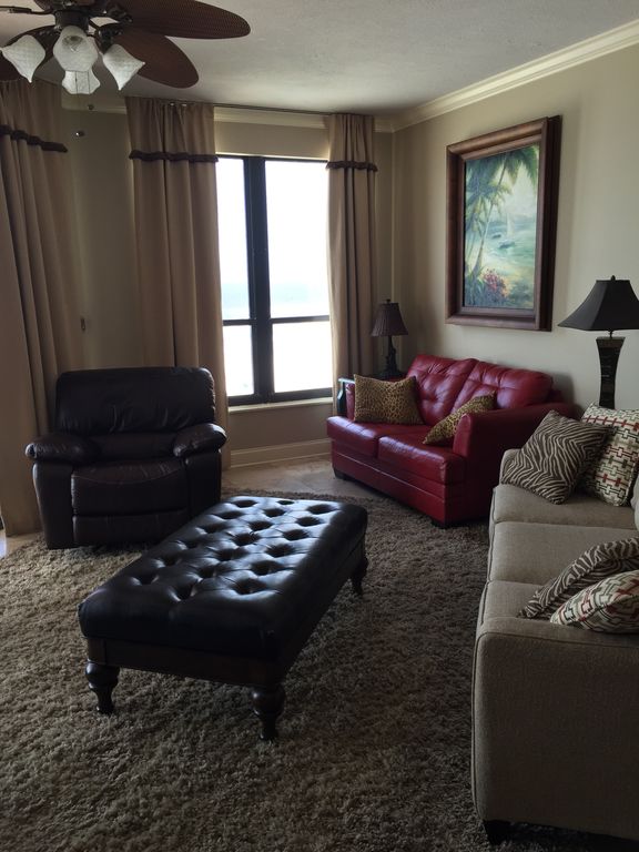This beautiful beachfront condo has been just recently been renovated and is ready for rental. This condo is complete with all new furniture, new tile flooring with cozy rugs, all new appliances, new cabinets, new kitchen accessories, granite countertops and much more. The master suite features a brand new king bed with new mattresses, a flat screen TV, and ceiling fan. There is also a oversized walk-in closet, room darkening curtains and an oversized jacuzzi tub. There is also access to the large balcony overlooking the beautiful Gulf of Mexico. The guest suite also has a brand new queen bed and new mattresses with a TV/DVD, one large closet, linen closet, and a ceiling fan. There is also a private bath and shower attached. The all new kitchen has been completely redone and has all new chrome appliances. The well stocked kitchen is perfect for eating in and the free standing ice machine makes filling coolers for the beach hassle-free. The den features a large living area with a large comfy couch and loveseat. The couch lets out to a queen sized bed. There is also a 42 inch flat screen TV for your enjoyment complete with a DVD. The view from the balcony is breath taking and being on the 10th floor allows you to see for miles as well as check on your family at all three outdoor pools. The pools are sprawled out across the property, one other being indoors. There are also hot tubs poolside and a grill. Across the street is a variety of shopping centers containing grocery stores, variety stores, movie stores, a post office, a pharmacy and more. Also, there are restaurants and Adventure Island with Putt Putt golf and games for the whole family. There is a guard around the clock and can assist you in any way. Also, the office is open daily and parking is never a problem. Beach chairs and umbrella rentals are available on the beach. Keywords: Condo More details