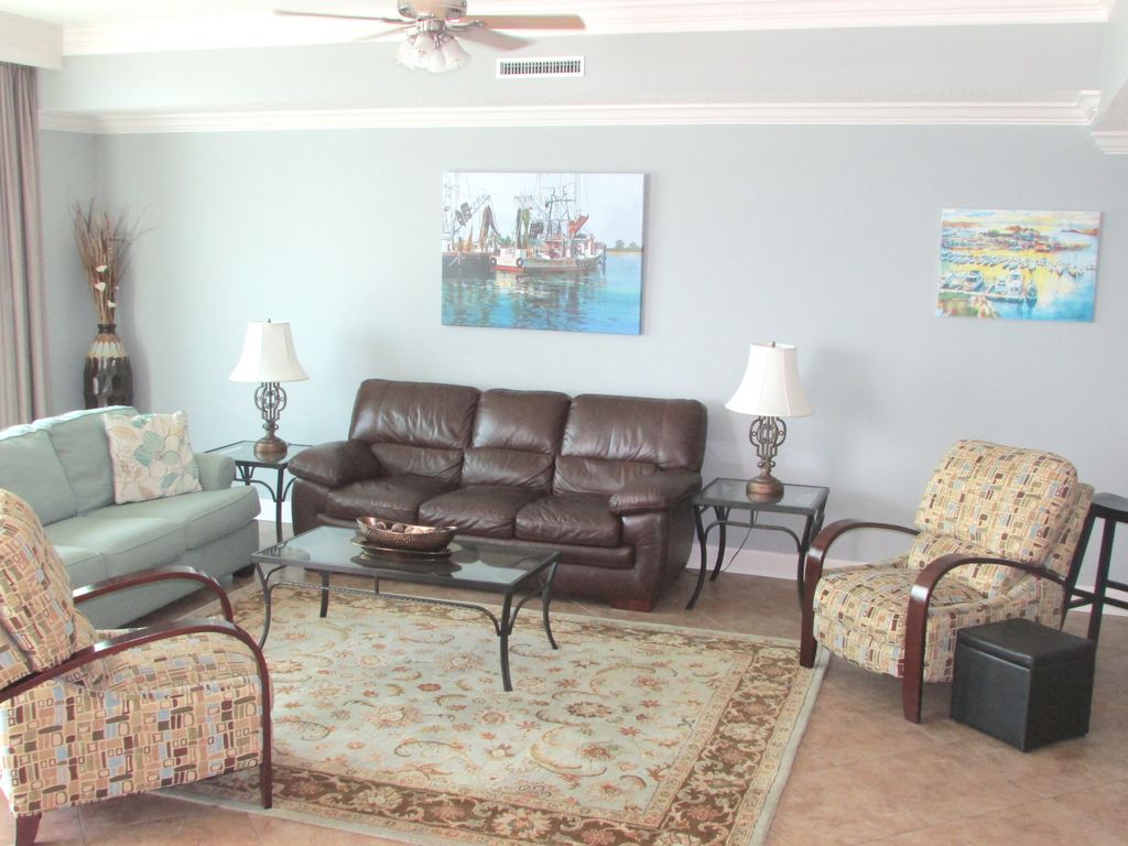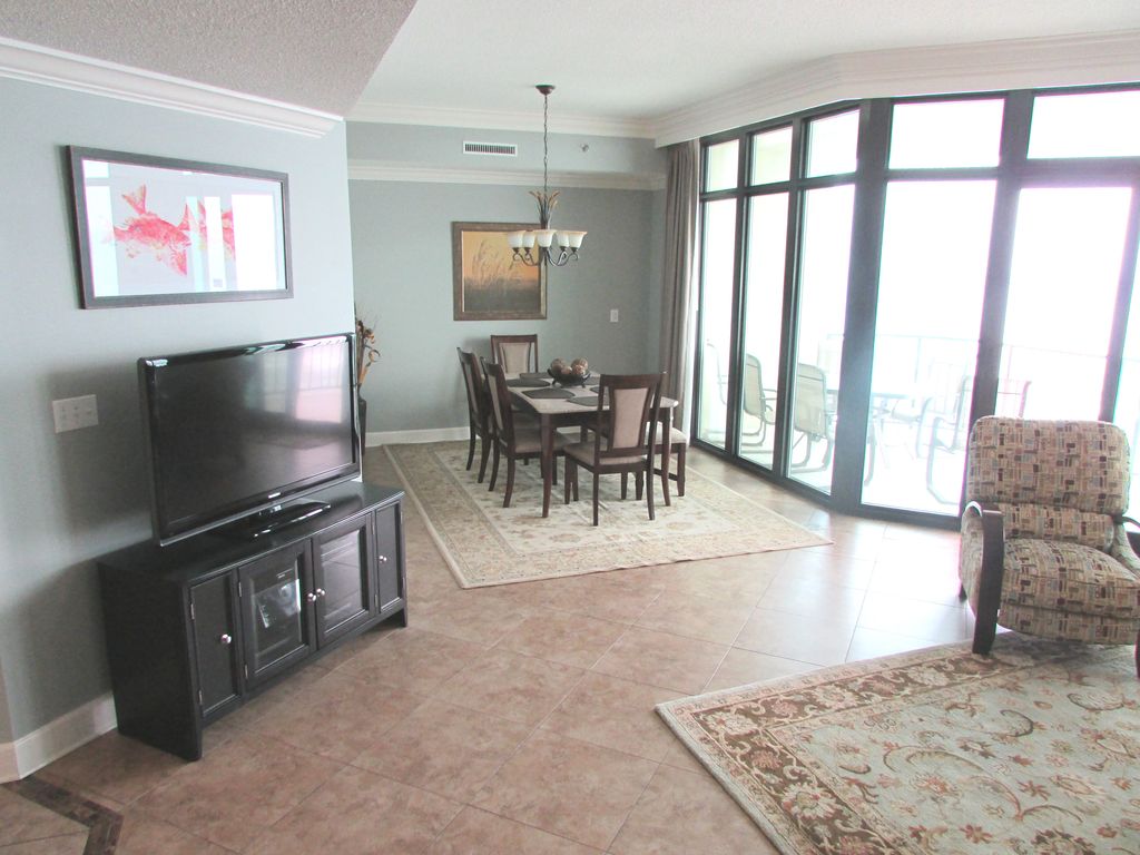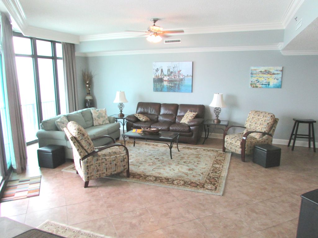 This is a beautifully appointed, professionally decorated 3 bedroom and 4 bath condo on the 8th floor. It has 4 flat panel TV's including a 46 inch flatscreen in the family room. With its modern decor and comfortable furnishing, this is truly a family resort vacation spot for your enjoyment!Upon entering this almost 2000 sf condo, you will feel relaxed and excited to be at the beach. The living area is decorated with 2 full sofas, 2 recliners and a large 46' flatscreen TV. It has floor to ceiling windows and breath taking views of the beach and ocean. A wet-bar and ice-maker complement the living area. The patio features a large seating area with a patio table overlooking the lazy river and spectacular views of the Gulf of Mexico.The condo's master bedroom has French doors which open to the dining area and beautiful views of the Gulf. The second bedroom is outfitted with a queen bed and a flat screen TV. The third bedroom has two queen beds and a flat screen TV. From the time you arrive and enter the grand lobby, you will feel you are in a tropical paradise. This condo is in the best location in the building. From the large patio and family room you have incredible views of the Gulf that spans for miles along pristine white beaches and clear blue waters. The condo provides a full size washer and dryer and the covered parking provides your car protection from the sun, heat and salt breezes. Enjoy a swim in the lazy river, while the kids spend hours enjoying the water slide. The heated indoor pool and two hot tubs are perfect for those cooler days. Near the indoor pool you will find a large state-of-the-art fitness room and sauna. Keywords: beachfront, condo, orange beach, orange beach vacation rentals, gulf shores, gulf shores vacation rentals, waterfront, perdido beach, beach, lazy river, pool, condo rentals More details