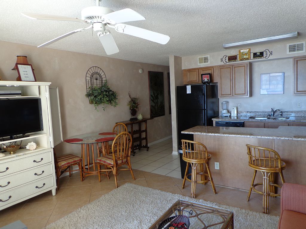 This is a one bedroom, one bath, fully furnished condo on the Gulf of Mexico. Wonderful view from the balcony, as well as, the living room and kitchen. Enjoy your morning coffee watching the sunrise and dolphins. This unit will not disappoint. Granite counter tops, quite location, tile throughout, washer/dryer, fully furnished kitchen, and many more amenities. New Flat screen T.V.'s installed 11/2013.
