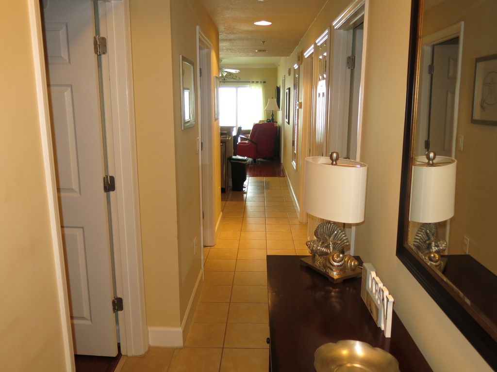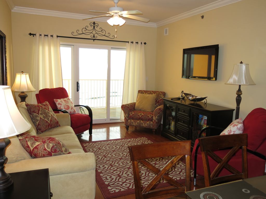 Communicate, book, and pay directly with the owners so you can avoid service fees.. If you have any concerns about working directly with us, please review the comments from our past customers and feel free to call or email us. We would love to speak with you. Begin your day watching the dolphins swim by (click on the video button to see them jump out of the water as they feed and play), and end the day viewing fabulous sunsets over the crystal blue waters and sugar white beach all from the large balcony of Unit #1106. In between, you are steps from the beach for fun in the sun, zero-entry interactive kiddee pool, indoor-outdoor adult pool (heated in cooler months), roomy hot tub, and huge exercise facility overlooking the gulf with a wide variety of exercise equipment, sauna, restroom/shower including a large sofa and flat screen TV.Built in 2006, the condo is one of the newest in Gulf Shores featuring luxurious amenities such as: hardwood oak floors in living/dining area, master bedroom, 2nd bedroom and 3rd sleeping room; tile in bathrooms, kitchen and hallway; stainless steel appliances; granite countertops in kitchen and bathrooms; flat screen TVs and DVD players in both bedrooms; and free WiFi throughout. The plush king size beds in the beautifully furnished and decorated master and second bedrooms, comfortable queen size bed in the 3rd sleeping room and foldout sofa in the living room permits sleeping up to 8 people. The master bedroom includes a private full bath, walk-in closet, and sliding glass door to the balcony. The second bedroom has a private entry to the second full bathroom. The well appointed kitchen will permit gourmet meals or you can grill at the condo community grilling area or visit one of the many restaurants that are within walking distance, such as The Hangout, Hooters, Waffle House, Sea and Suds, and many more. The living area includes 2 recliners for relaxing after a fun filled day, and the dining table sits 6, plus 3 stools at the kitchen bar. This spacious condo (1130 sq ft) includes 9ft ceilings, ceiling fans, crown moldings, a walk-in laundry room with full size washer and dryer with plenty of storage space, and covered parking.NO Smoking and NO PetsAddress: 401 East Beach Blvd., Gulf Shores, AL 36542 Contact us to reserve your vacation dates now. More details