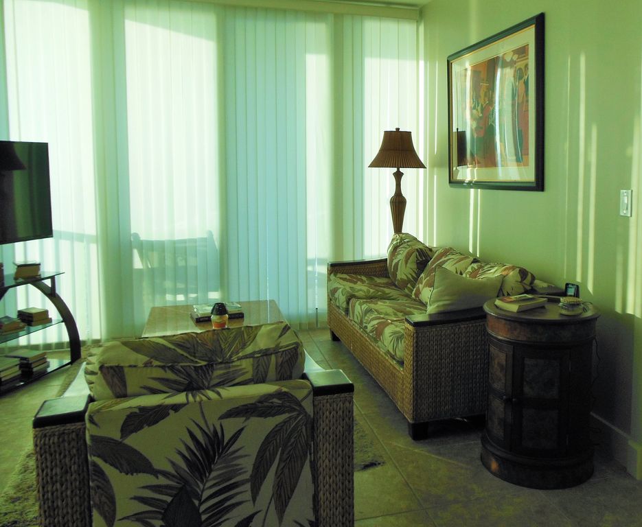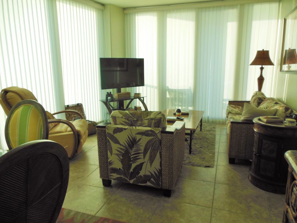 The Island Tower is one of the newest buildings on the beach. It has low density, a truly Class A building and offers luxurious condos at an affordable rate.As a contractor and interior decorator by trade, we were sure to make our Island Tower condo truly a home away from home. This luxury east corner unit is 100% private and features unobstructed panoramic beach/gulf views on three sides of the unit. We offer one of the best views in Gulf Shores since the unit is on the 21st floor making it completely private and above surrounding buildings. There are only three units per floor and afford private balconies. The beach and the gulf stretch as far as the eye can see and the sunrises and sunsets are not to be missed. Sometimes at night the moon is so close, you can almost reach out and touch it. On a clear night, you can actually see the lights of Mobile. This east facing unit also means you are not battling the hot afternoon sun in the unit when you come in from the beach. The view is absolutely breathtaking - pictures cannot do it justice no matter how picturesque they may seem. The nine foot ceilings, open floor plan and floor to ceiling windows create a spacious living quarters that make you feel that you are always on the water. Although the granite counter tops, wall designs and faux master bedroom walls surround you with quality, the condo is a comfortable,fun, peaceful and relaxing environment - just like home! The common area offers a family-size dining room table with six chairs, a separate seating quarters with sleeper sofa and chairs, complete with a 50' flatscreen TV, and blue ray perfect for entertainment - all of course amidst the spectacular views! This unit has a huge gourmet kitchen with stainless steel appliances, granite countertops, european cabinets, large granite bar and a unique glass tile backsplash. The unit offers three bedrooms and three full baths. Ceramic tile is throughout the unit. There are two large balconies - gulf front and beach views. Both are furnished for dining outdoors or just watching the sunset.The gulf front master bedroom has a king-size bed, faux finished walls, an inviting master bath with Jacuzzi tub and a separate shower complete with a massage shower head. The huge walk in closet has ample room for your clothes regardless if you are staying a week or a month, flat screen TV, blue ray, ceiling fan, a fantastic beach view through the gulf front wall of windows with sliding glass door to the large balcony.The two guest bedrooms have sliding glass doors (floor to ceiling) to the beach side.The front bedroom has a queen-sized bed with private bath, flat screen TV, blue ray, and ceiling fan. There are clouds stenciled on the ceiling of the bath.The middle bedroom is decorated with a surf board wall covering, has two twin beds which are great for kids, flatscreen TV with built-in DVD, ceiling fan and a full bathroom across the hall. There is a also a full sleeper sofa located in the family room. The utility room has a full-size washer and dryer with an iron and ironing board. Island tower is set up for families to enjoy with an outdoor pool, indoor heated pool, sauna, a new barbecue grill area with gliders, exercise room overlooking the beach and gulf. In addition, families are offered beach services where you can rent umbrellas and beach lounges by the day or week. The covered parking is also a plus.Island Tower is located on West Beach Boulevard just a half mile West of Highway 59. Quality restaurants, entertainment, shopping and a variety of activities are within walking distance or nearby. WaterWorld has added a new six lane mat slide; you can zip line across Gulf State Park, enjoy the new restaurants in the area and get ready to take the plunge to discover the newly sunk 40' cargo ship!Enjoy private dining on your own balcony with awesome views of the Gulf and beach and gorgeous sunsets. Step off the pool deck onto the sugar-white sands of our private beach and a few short steps will take you to the beautiful waters of the Gulf of Mexico.New restaurants and outdoor activities are opening every day! Come check us out!An enjoyable vacation awaits you at the Island Tower. You will not want to leave! Let yourself relax and unwind in style - welcome to paradise! Keywords: premier condo, highrise, waterview, low density, panoramic view, indoor infinity pool, outdoor inifinity pool, gym, exercise facility, sauna, dedicated parking, covered parking, assigned parking, east corner unit, direct beach access, spacious, roomy, washer, dryer, full kitchen, jacuzzi tub, balcony, wifi, dish network, Internet More details