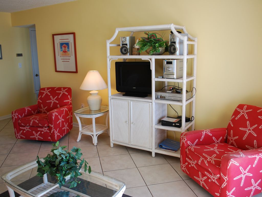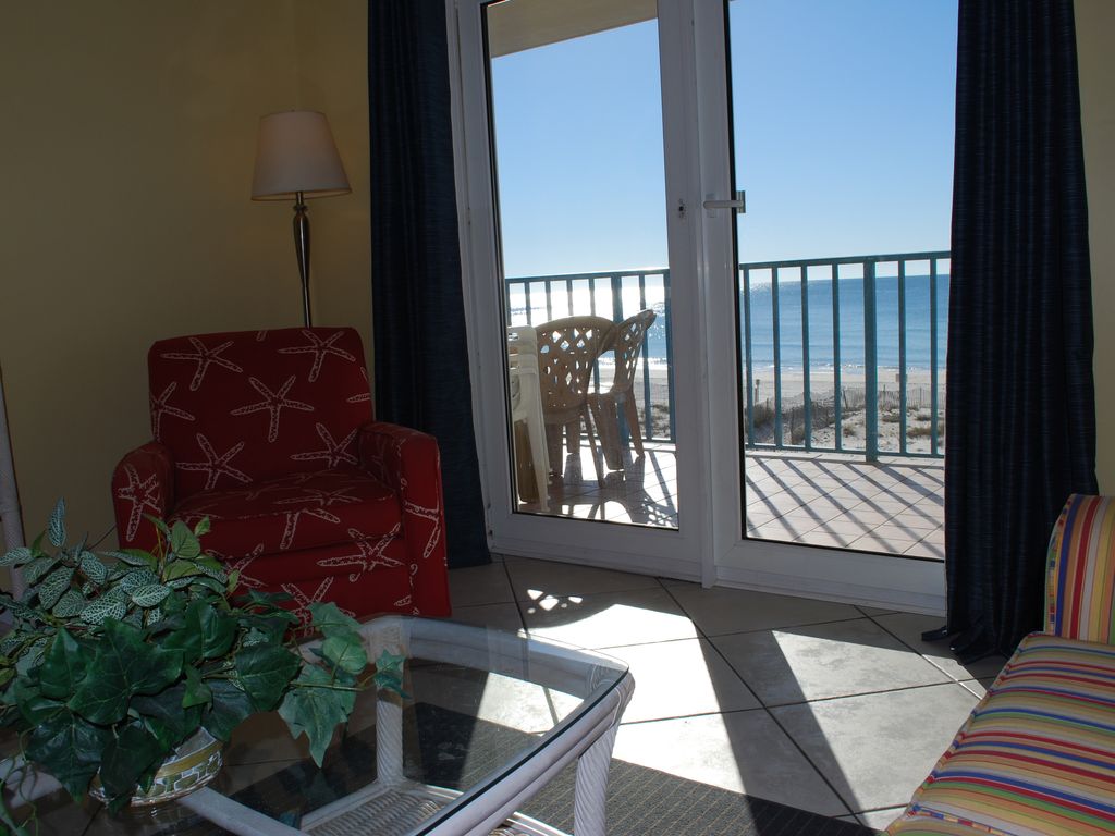 OVERVIEWDo you want an affordable Gulf front vacation with great amenities at low prices? Our Condo is for you! This two bedroom unit is priced as low as many one bedrooms. It's like you get the second bedroom and bath free! We strive to keep our rates some of the lowest in the building.This direct beachfront two bedroom, two bath unit gives you front row seats on the beach and Gulf. There is NOTHING but a pool between you and the water... Dig your toes into the sugar white sand and relax, or play in the heated oceanfront pool! Watch the sunrise without getting out of the king sized bed in your oceanfront master suite. CONDO Perfect for families and affordable for couples, our unit is loaded with extras to make your stay enjoyable. My husband and I have two children so we know how to make a place 'kid friendly'. We have put a lot of thought into setting up the Condo and have three flatscreen TV's, DVD players, stereo, Xbox with games, DVD library, board games, books, beach chairs, beach umbrella, and sand toys there for you to use. You don’t need to drag all that stuff with you from home! We even have a pack-n-play and a portable high chair for the little ones… The master bedroom has a King bed with French doors opening onto the balcony. There is a wall mounted flat screen TV and a large closet. Your bath has the sink/dressing area separated from the shower, so it feels like having an extra half bath. The second bedroom has a Queen bed, another flatscreen TV and another full bath.The spacious main living area has another flat screen TV, comfortable seating, and amazing gulf views. The tiled balcony is huge and adds another 180 square feet (8X22) of space to spread out. Have dinner on the outside table, or relax on the loungers and watch for dolphins.Of course there is also a fully equipped kitchen. A frig, dishwasher, microwave, brand new stove, washer/dryer, blender, toaster, coffeemaker, pots, pans, dishes, etc... If I have it in my kitchen at home, it is there at the condo too! We are constantly updating the unit and this year added a new washer/dryer, new sleeper sofa, and lots of other little extras for you!BUILDINGThe building has free WIFI, an elevator, two large pools (one heated year round), two kiddie pools, luggage carts in the lobby, and on-site security.AREAIf you aren't familiar with Gulf Shores, it is an awesome location. We have a little library of guidebooks and area information in the Condo for you to use. And since we lived in the area for 5 years and visit often, I will be happy to share my area knowledge and spend time talking with you and helping to plan your trip. You can golf, shop, parasail, bike and hike in the state park, eat at great restaurants, take a day trip to the Blue Angel Museum in Pensacola or the Battleship Alabama in Mobile (getting tired yet?) Or you can hang out on the beach all day, and have pizza delivered in at night. The choice is yours!The mild temperatures in the off season, heated pool, and wealth of area attractions make our condo a great vacation spot year round. Come and stay at our place!!!Keywords: condo, oceanfront, beachfront, vacation, value, affordable, pool, waterfront More details
