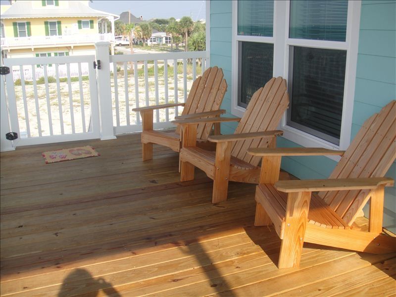 This beautiful, beach house completed in April of 2011 is located right on Pensacola Beach Sound and has its own private beach. The Gulf is also within just a short walk. The central location of the house allows you to easily walk to restaurants, shopping or a night out for adults at nearby bars and clubs. The house has a little less than 2000 square feet with 4 bedrooms and 3 full baths. It also has a bunk room with triple bunk beds and an office with a single futon bed in it. The master bedroom has a kingsize bed and an adjoining bath with a large tub, double sinks and separate shower and toilet. There are two bedrooms with queen size beds and one bedroom with twin beds. There are 5 flat screen TVs , one for each bedroom and a large 50' TV in the living area with a DVR player.. Relax on the deck adjoining the master bedroom with coffee in the morning or drinks with family or friends in the afternoon while watching the sunset. There is a deck also on the first level and a large deck on the ground level. All decks have beautiful sunset views. There is a beach butler cargo lift which goes to both levels and is operated by a remote. It is wonderful for luggage and groceries but is not meant for people. We added another refrigerator in the bunk room. We have also added a boat dock and boat lift this summer (2012) - a really great addition! The house sleeps 10 to 12 with 8 in bedrooms and a futon chair and bunk beds.Keywords: New, centrally located, comfortable,non smoking,waterfront, More details