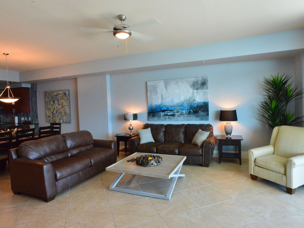 We do accept online payments using a professional booking system - just not through this particular site. -- Check availability calendar -- High-end Luxury Gulf Front condo at the premier resort in the panhandle area.• PRIVATE HOT TUB and outdoor kitchen on your 400 sq ft balcony overlooking the Gulf • SWEEPING Gulf views from your 8th floor perch • Appx 2500 sq ft: sleeps 10 IN BEDS (no sleeper sofas) = King, King, and (1) set of Queen bunks(W/Queen trundle). MAX of 6 adults due to bunks but max of 10 total. • Gorgeous furnishings, leather couches, soothing colors, high-end electronics, gourmet kitchen with Subzero/Wolf appliances, complete luxury! • FIVE salt-water pools (including Lazy River and gated toddler pool), chair service, tennis courts, fitness center, playground, on-site spa and poolside bar/grill with live music most afternoons • Free Wi-Fi, Flat panel TVs, SONOS wireless speaker system, wi-fi printer for your use • Wet Bar with ice machine (makes 20 lbs/day), wine fridge, sink • Incredible indoor pool areas plus sauna, steam room, state-of-the-art fitness center, two tennis courts, and stay-cool surface play ground! • Surrounded by activities, and 25+ restaurants, shopping, golf, marinas, dolphin cruises, the zoo, water/amusement park Please click *** CALENDAR *** tab just above main photo for availability. ................................................................. This condo is very high-end, slightly modern and elegant, yet kid-friendly and casual. Turquoise Place is well-known as the premier resort in the Ala/Fla panhandle.~ FIVE TOTAL POOLS on property: including Lazy River which is heated in off-season, gated baby/toddler pool, two INDOOR pools, zero-depth entry pool~ PRIVATE Jacuzzi-brand HOT TUB on your balcony plus outdoor kitchen with gas grill and sink~ on-site bar/grill (seasonal), chair/umbrella service (seasonal) - plus SPA, gift shop~ SONOS wireless speaker system - stream from your phone/Ipod/latpop, etc~ Bedroom #3 alone sleeps SIX = Queen Bunks PLUS Queen trundle.~ 400+ thread count linens, plush towels.~ Two leather couches provide tons of seating, plus additional chair by windows~ well-equipped wet bar with blender, icemaker, drink shakers, all glasses, and built-in wine chiller. ~ regular AND convection oven, warming drawer, Wolf gas cooktop, Subzero Fridge, spacious pantry, and everything you'll need to cook a gourmet meal, including basic spices.~ Wi-fi, four HD flat-panel TVs, voicemail system, wake-up calls, all modern electronics.~ Balcony has comfortable seating This is the place that you can say, 'now this was truly a vacation'! More details