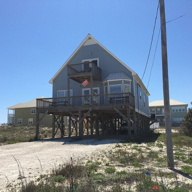 Great views, steps to the beach, a private pool, two master bedrooms, covered parking, covered entrance and pet friendly at no additional cost. This home has it all and is located on a quiet dead end street with easy beach access, only 18 miles West of Gulf Shores and close to Historic Fort Morgan. The four bedroom, three bathroom property offers awesome views of the Gulf and of Mobile Bay from multiple decks located on the front and rear of the home. The home is a well planned 1800 square feet on two levels providing plenty of space for family and friends to gather. The living area offers Gulf views and is open to the dining area and kitchen area creating a wonderful space for everyone to eat and relax together comfortably. Three bedrooms are located on the main floor along with two full bathrooms. One queen bedroom is located off the living room and shares a bathroom with the bunk room. There is a second master bedroom on the main level with a queen bed, two sets of sliding doors opening to the porch and deck overlooking the pool and a private bath with a tub and separate shower. The second floor is designated as the Master suite with a king size bed and a private full bath as well as a deck offering fantastic views of the gulf and bay. The best of both worlds....just a fews steps to the beach but the private pool offers a great alternative to the beach making this home a perfect getaway for your family. Head off to the nearby historic Ft. Morgan to explore, take the ferry to Dauphin Island for the day, ride bikes, watch the dolphins play or head across the street to Gulf Shores Marina for fresh seafood a cold drink and a beautiful sunset. More details