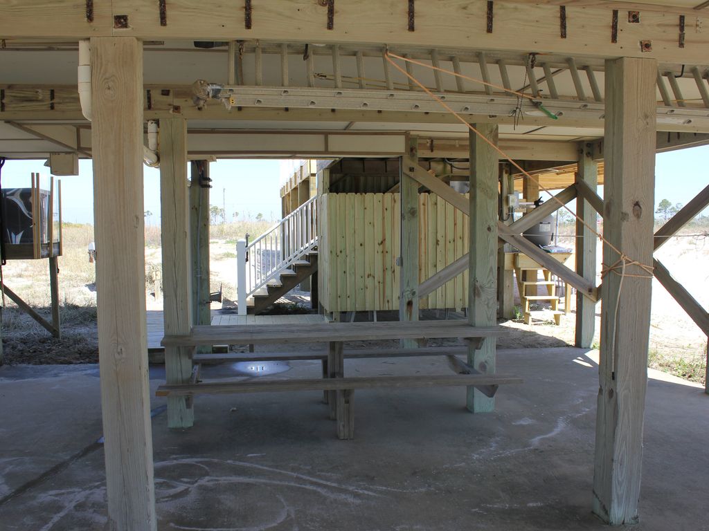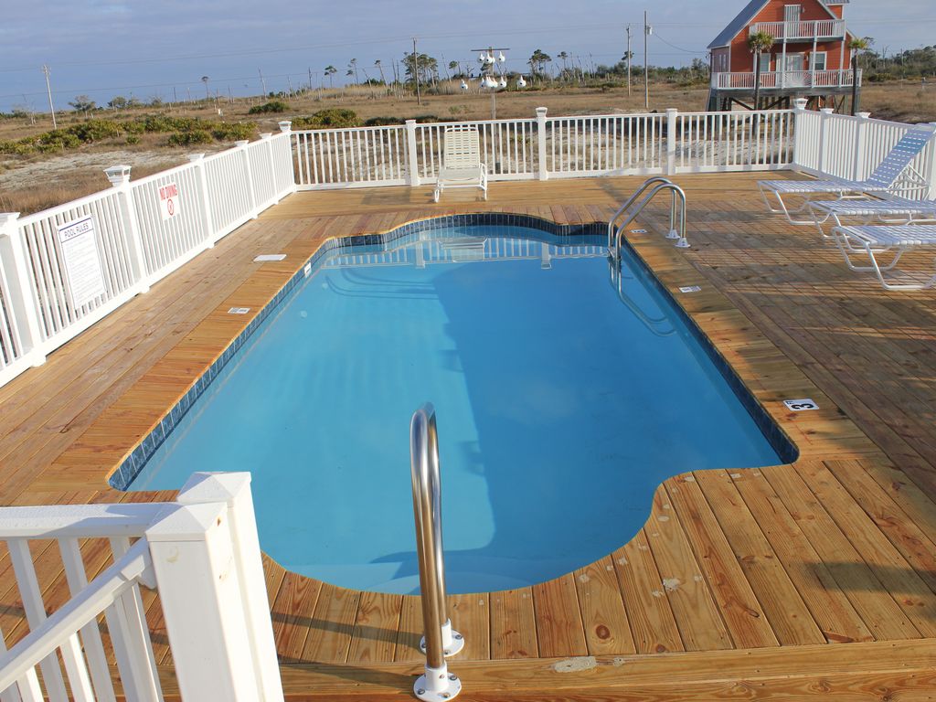 Shore Thing Beach House is a very nice 3 bedroom-2 bath house featuring a beautiful 12 x 28 private swimming pool, surrounded by a 25 x 40 sun deck. This home offers the best of both worlds. You can spend the day at the beach frolicking in the warm waters of the Gulf of Mexico & playing in the sand or, if you prefer, you have access to your own private pool. The deck provides awesome views of both Mobile Bay and the Gulf of Mexico and is perfect for sun bathing. When you come back from the beach be sure to rinse off in the enclosed outdoor shower with both hot & cold water. Morning sunrises to late night talks can be spent on the covered front porch which offers a swing, rocking chairs and a picnic table. Other amenities include DirecTV with Genie, TV’s & DVD’s in all bedrooms and living room, an outdoor grill and a very well stocked kitchen. Of the 3 bedrooms, the master bedroom has a king size bed; bedroom 2 has a queen size bed and bedroom 3 has a queen & twin size bed. The living room has a queen size sleeper sofa. Sleeps 9. Free WIFI, microwave, blender, coffee pot, dishwasher, laundry room.Must be 25 years of age to rent this home. No smoking and no pets allowed. More details