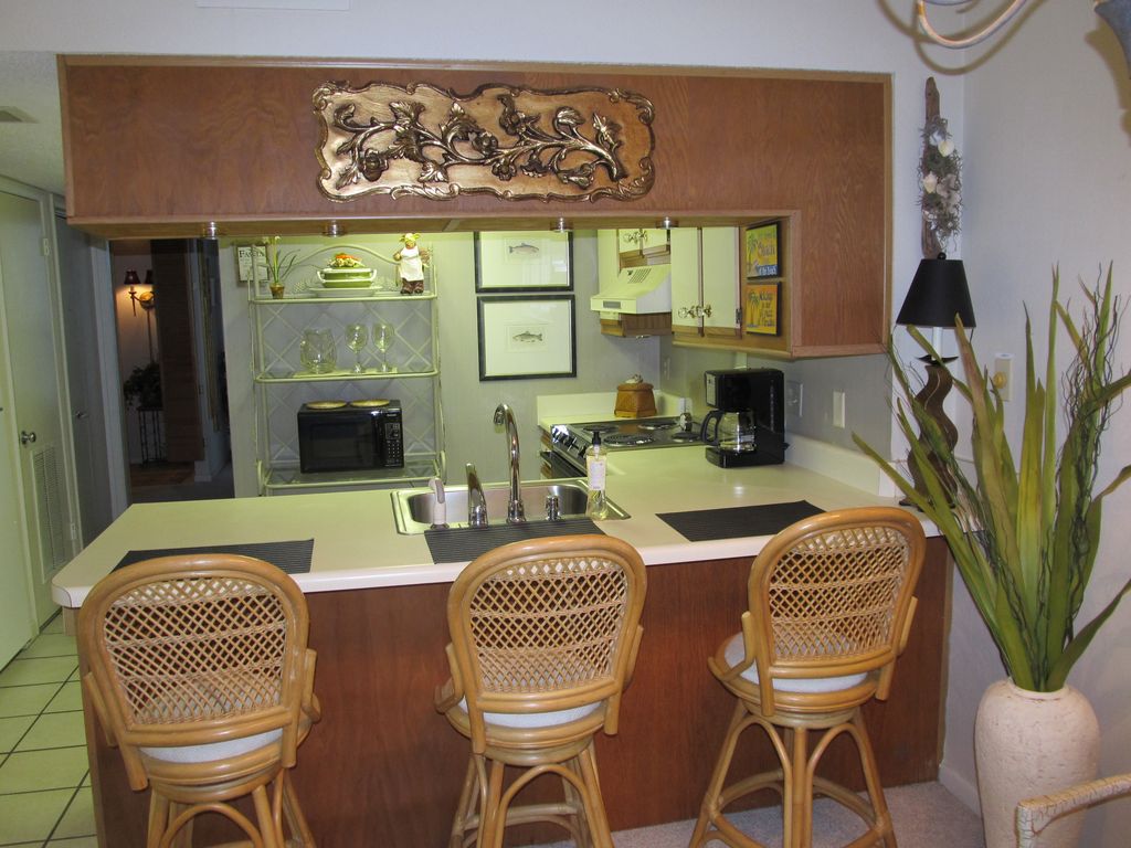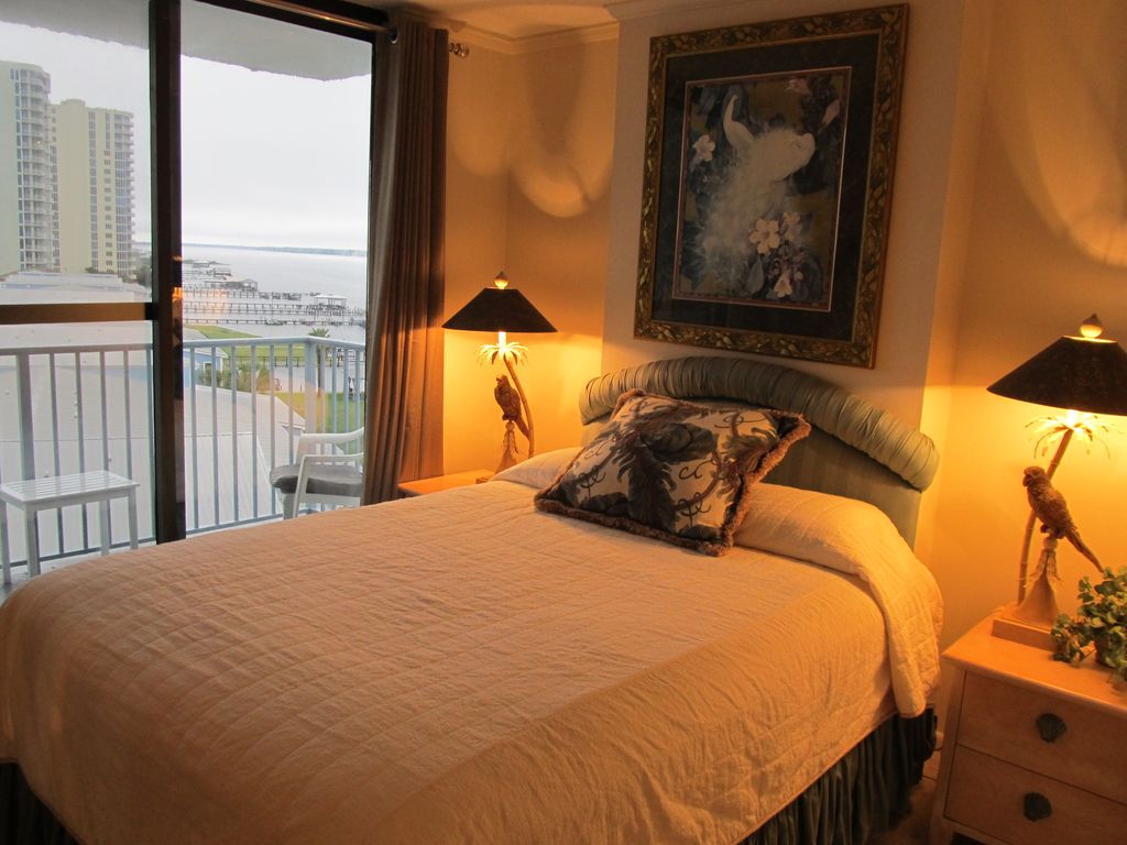 We do not rent to students (or their parents) for Spring Break. Corner unit with 2 lg balconies, 1 private bedroom (new mattress and box springs Dec 2015) w/view of gulf & lagoon. Full kitchen and nice size sitting room with queen sofa bed.Great for a romantic getaway or a small family vacation.Gulf Shores Surf and Racquet club offers the better of 2 worlds - right between the Gulf of Mexico and the Little Lagoon (7 miles long). On the gulf you will be delighted with the wide, white, private sandy beach. In addition to the beautiful beaches, we offer a covered Gazebo on the beach just for guest of Gulf Shores Surf and Racquet Club. Wonderful view of Gulf/Beach and Lagoon from your condo.On the lagoon side of the resort you will be thrilled with the boat ramp and two private piers, one with boat slips. Bring your fishing gear for fishing off the pier or in your boat, canoe, kayak, or Jet Ski. Want some exercise? Try our two lighted tennis courts, shuffleboard, horseshoe pits and more. In addition, on the Lagoon side is a large pool with a rock waterfall with beautiful landscaping, lush palm trees, flowers and many places to sit and soak up the sun or shade under the palm trees. The children's pool is steps away. Close by is an adult hot tub. Charcoal grills and picnic tables by the Lagoon are perfect for grilling by the sunset. This beautiful 1 bedroom, 1 bath, beautifully decorated condo has everything: furniture, appliances, house wares, AC unit and more. The unit has a washer, dryer, iron and ironing board. The kitchen is fully-equipped. The living room has a queen-size sofa sleeper, flat screen cable TV, plus your own personal secure Wi-Fi network. Within 3-10 miles you will find endless restaurants, shopping, amusement parks, and full city recreation park with racquetball courts, indoor and outdoor pool, tennis courts and full gym and weight room, (Just a note about Privacy…most of the one bedroom condos do not have a door. This condo has a door to the bedroom that gives you privacy from the rest of the condo..Non smoking unit, no petsCheck-in time: 4:00 p.m. Check-out time: 10:00 a.m. Our family awaits your visit. We are committed to you and your family having time to spend quality time together or build relationships with friends. We have been renting beach property for 10 years and have always provided great service with absolutely no issues. More details