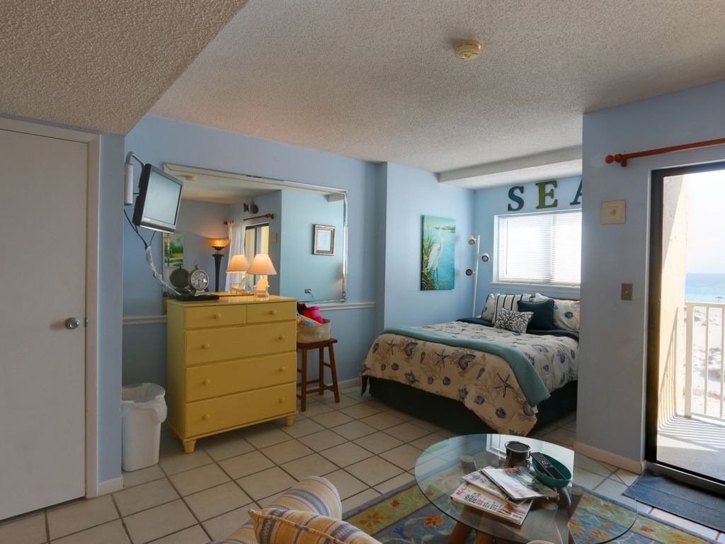 Welcome to "Moore Beach Tyme"!We are so pleased to now have the NEW indoor pool OPEN as an exclusive amenity for the Dunes building.Stay with us on the sand! Our oceanfront studio is like your very own small "casita" on top of the dunes. Plus, we won't break the bank!As you walk in, you are greeted with an AMAZING beach front view. NOTHING is between you and the sea breezes and sound of the ocean.Relax and enjoy a drink on the private balcony. The sunrises and sunsets are nothing less than spectacular. Enjoy the fun and beachy casual decor throughout.Sleep like a dream listening to the sounds of the sea on the comfy pillowtop mattress! The kids will love the full size bunks that offers privacy with a closing curtain so they can snooze away. Perfect for a couple or small family! Sofa sleeper included for that extra guest who may come along!Kitchen is fully equipped with all the basics to enjoy a full meal and save by dining in! You will find the size "just right". Located on the 3rd level, you are just steps away from some of the whitest beaches in the world. Complete with tennis courts, basketball, putting green, shuffleboard, horse shoes, outdoor grilling areas, (7) outdoor pools, Kiddie pool, hot tubs, sauna, fitness center, spa, free Wi-Fi, and 24/7 guard security complete with guarded entrance. In addition, Championship golf at Kiva Dunes is just next door. Enjoy the seclusion and privacy away from the traffic of Gulf Shores and Orange Beach, but still have access to the amenities they offer only 12 miles away. Local attractions include Charter Boat Fishing, Historic Fort Morgan, Waterville U.S.A. water park, Tanger Outlet Mall, and a host of other restaurants, shops, and fun activities. There is a $20 vehicle registration fee that will be included in all bookings after 01-14-17.Enjoy our Beach towels, and family friendly selection of dvds. Also equipped with cable T.V. and dvd player.Our unit comes complete with starter paper, 8 count towel set and full linen. Coin operated or card swipe laundry facility is located on the ground floor with the other building amenities (2 indoor hot tubs, sauna, fitness room) exclusive to Plantation Dunes. And don't forget the new indoor pool which provides a pleasant option for the whole family. More details
