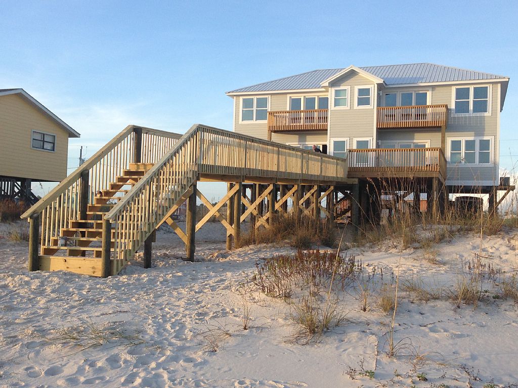 Welcome to Pipe Dream westCheck out the newest beach-front duplex in Gulf Shores. Available starting April 5 2015. We are located 15 miles from Highway 59 in a private beach community on the historic Fort Morgan peninsula. The house is on miles of residential beach, but only minutes from all the excitement of Gulf Shores and Orange Beach.Be sure to check the east side of the home at vrbo #629465 if this is booked or you are interested in renting both sides.Enjoy our home with almost 1700 square feet of living space per unit. With 3 bedrooms and 4 bathrooms, this unit will accommodate 8 people in comfort. We have a soundproof wall between the units with an interior door that connects them - ideal if you're renting the entire home.It is family-owned and managed and is designed with all the comforts of home in mind. It is being built by Tom Martin, one of the premier home builders in the area and the furnishings will be all new, designed with the help of a well-known local interior designer. We invite you to take a look at our home and give us a call if you have any questions, or would like to be one of the first to book a stay with us.Living area:The living area looks out over the Gulf and opens to the large deck through the 9 foot sliding door. The living room will have a Sofa/Hide-A-Bed, recliner and 2 chairs plus a 60-inch TV, DVD player and Bluetooth stereo.Kitchen and dining area:The fully-equipped kitchen offers all the conveniences of home. With service for 12, you will find everything you need to serve up a great meal. The pantry closet offers plenty of room for a week's worth of groceries. The dining area has seating for 8 at the table and 4 stools at the breakfast bar.Laundry Area:The laundry closet has a full-size washer/dryer with hanging rods and ample shelving for storage.Bedrooms:All bedrooms will have a private bathroom and HD T.V.s with DVD players.The master suite has a king size bed, desk and a walk-out to a private beach-front balcony. The 2nd bedroom (upstairs) has 2 queen beds, separate closets and an ocean view. The 3rd bedroom, located on the main floor, has a queen bed and windows overlooking the street.Outside:Outside you will find parking for 4 cars on our paved parking area, a grill and a place to dine in the shade under the center of the building. The unit has covered stairs leading to a private entryway and the deck has a 6-foot shared walkway to the beautiful white sand beaches. The deck has an 8x16 ft divided area opening to a 12x 32 shared area ideal for groups. More details