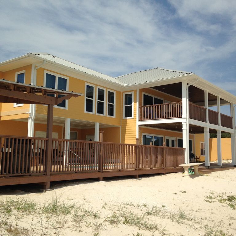 Come enjoy your wonderful and relaxing beach getaway at this beautiful and unique, completely renovated ( 2014) two level home , sitting on top of the sandy white dunes of Ft. Morgan peninsula, overlooking the beautiful waters and beaches of the Gulf of Mexico. If you want to escape the crowded beaches, and enjoy a quiet vacation, Top O' the Dunes is the place to be ! The upper level has a large living room and dining area with table that seats 12 comfortably , fully equipped kitchen with bar counter/seating, laundry room, master suite with full bath, king bed, adjoining sitting room with twin sleeper (ideal for baby nursery), 2 guest rooms with 1 queen bed in each, full guest bath with corner tub and separate shower, large study with queen sleeper sofa, and large covered deck off the living area, with wonderful gulf views !The downstairs level has a large living area with dining/game table, kitchenette/bar area, master bedroom with king bed, large guest bedroom with 2 queen beds, 2 full baths, large covered deck with picnic table , 'dipping' swimming pool with sunning deck and outdoor shower, covered cooking area with barbecue grill and counter space - ideal for family gatherings and entertaining! The sandy white beaches are easily accessible - a short 90 yard walk out the back door ! Available for Sunday to Sunday rental during the peak summer season. 2 and 3 night rental is available during off peak seasons. No student groups are accepted. Renter must be at least 25 years old to rent property, and an adult, also 25 years or older must be present during the rental period. Please come and enjoy this beautiful beach house for the perfect , relaxing vacation getaway ! Sit back and unwind as you take in the beautiful sunsets !Check out our other property located in the same subdivision! Coral Dunes - property # 938047 . Sleeps 10 More details