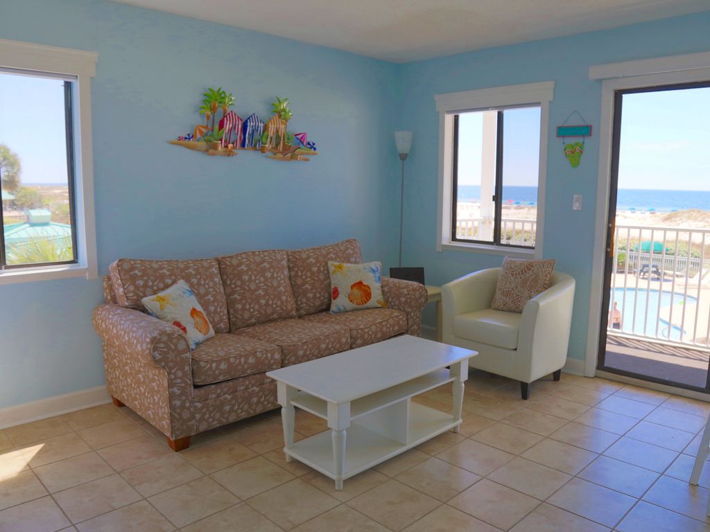 Breathtaking Gulf Views! Bright and Beachy Decor, Second Floor, Gulf Front Condo. Our Corner Unit has two more Windows than Interior units, for extra Natural Light. The Fun & Beachy decor is uncluttered, with lots of built-in storage, and Plenty of Room for all those items you need to bring along on Vacation! The Bedroom has a Queen Bed. and the Living Room has a Queen Sleeper Sofa. There is a Dressing Table and separate Wardrobe for the guests using the sleeper sofa. Super, Super Clean with All Tile Floors. You're Going to Love it!Gulf Shores Plantation is a low density, Family Oriented destination resort. Located 12 miles down the Ft. Morgan peninsula, directly on the Gulf of Mexico, and across from beautiful Mobile Bay, the complex is rich with amenities. Our beautiful outdoor pools, one of which is heated seasonally, our indoor heated dome pool, lighted tennis courts and basketball court, shuffleboard, and horseshoes are available free for your enjoyment.