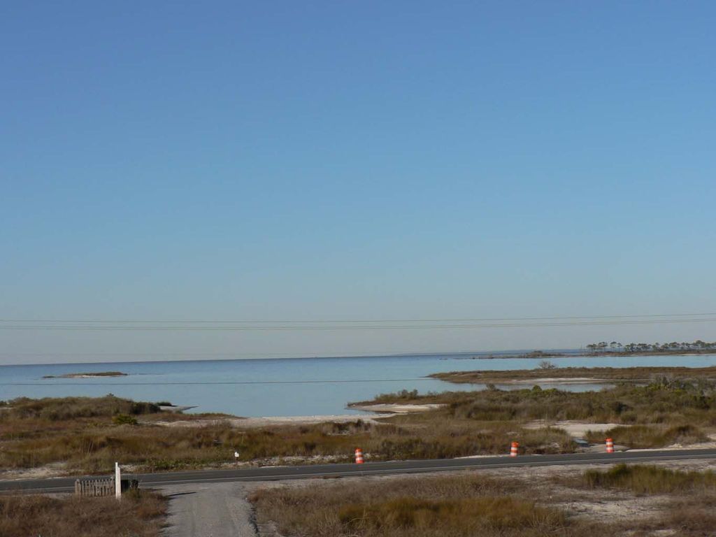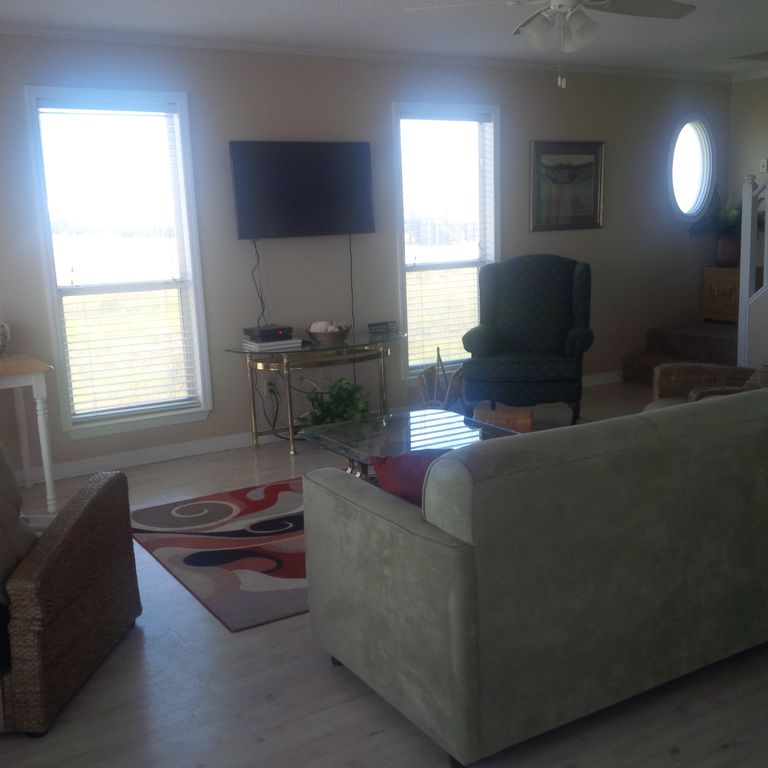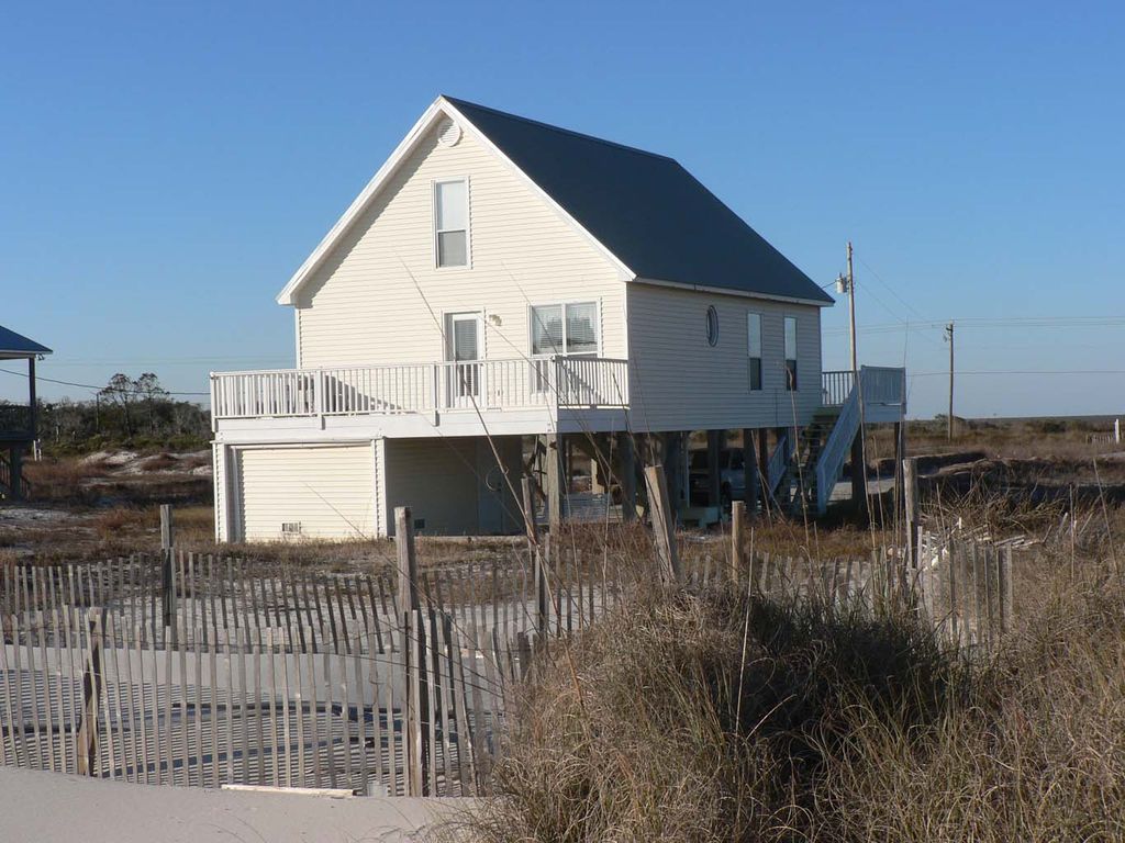 FLEXIBLE DATES! September -May, owner may accept less than a 6 day rental. KC's Cove is directly situated across from Mobile Bay (St. Andrew's Bay) and has a magnificent view from the north side of the house, including both the main and upper decks. The view of the Gulf of Mexico sparkles so brilliantly from the back (south) deck, and with the brilliant white sand, your sunshades will always be in order. Picture yourself sitting on the back deck soaking up the sun, while hearing the sound of the pounding surf, drinking in the smell of the warm salt air, and hearing the call of the laughing sea gulls circling above, with a lone Pelican slowly lumbering past.... You don't want to sit in the sun? Well, there is a lovely concreted area underneath the house with a picnic table, a large swing, and room to relax out of the sun but still hearing the surf, seeing the beach, smelling the salt air and feeling the constant Gulf southerly breeze blowing against your face. KC's two (2) story, 1500 sq. ft., three (3) bedroom, two and a half (2.5) baths, full size washer/dryer, with a fully equipped kitchen---is all you need for your beach get away. Conveniently situated just a few 100 yards from the actual beach (beach side), and the stunning Mobile Bay on the other---with small boat access at the natural boat launch...and a birding site to boot! Wow! KC's not only offers wonderful views, but also with updated accommodations at an affordable price! What else do you need? Well, with granite counter tops, driftwood hardwood flooring, updated bathroom fixtures, new mattresses, and a well equipped kitchen; it is not only comfortable, but is just plain out cute with a pleasing beach and water themed decor. KC's is all you need for your party of eight (8) guests or less to have a great time at the beach.