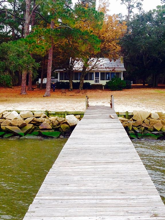 We have looked for the perfect beach house for many years! We finally found it in the summer of 2014. This cottage sits on a secluded 4 acre lot surrounded by live oaks and huge pines! You can enjoy the sunrise and sunsets overlooking Mobile Bay while sitting on your screen porch or out on your private dock. Bringing along a canoe or small boat, you have your own small boat launch from the yard. This cottage is one of a kind! The interior is a classic with heart pine floors, walls and ceilings. The cottage has 3 bedrooms, with the master suite having its own bath. The other two bedrooms share a lovely bath. There is a laundry room with washer and dryer. The kitchen includes a full stove and oven, dishwasher, and all the necessary cooking supplies to make it possible to prepare your own meals. Or you may drive just a couple of miles to enjoy fine cuisine at a number of restaurants at the Beach Club or in Gulf Shores.Mobile Bay is a fisherman's paradise! You can fish off your private dock, catch live crab with one of the traps on site, or put your boat in and enjoy the bay. If you enjoy the beach side of Ft Morgan, the Mobile St public beach is a short drive (or bicycle) away. I love to walk or run the Pine Beach Trail across highway 180 through Bon Secour National Wildlife Refuge. See photos to see the beauty! If you like to ride bicycles, there is a nice bike trail just down the road that goes all the way into Gulf Shores. The cottage is only about 8 miles from Gulf Shores, close enough to run to town for groceries! More details