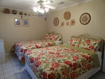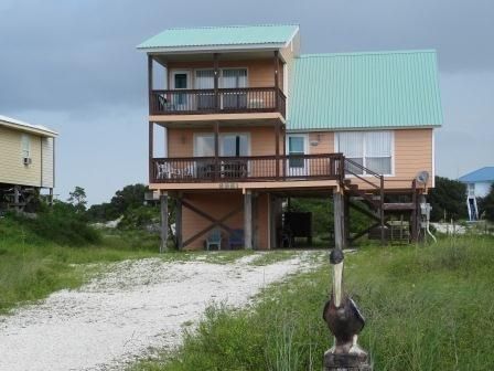 The 'Dunes' Beach House is located in Cabana Beach subdivision, 8961 Pompano Way, on Fort Morgan Peninsula (an area that has beautiful sugar white sand beaches) in Gulf Shores, Alabama, next door to the open, uncrowded beach of Bon Secour Wildlife Refuge. We are almost beachfront without the cost. Pompano Way Road dead ends in front of our house, walk left out of our driveway and about 40 steps you are in the Dunes, no roads or lots to cross. Just down the road is the historic Ft Morgan, and a ferry that crosses the bay to historic Fort Gains on Daulphin Island. The 'Dunes' brings back memories of long ago, when you sit on one of the two decks, and listen to the birds, watch the waves roll in and sometimes dolphins playing. You can enjoy the beautiful sunrises and sunsets, see the stars at night with no obstruction of street lights. The two story Beach House is cozy with two covered decks, swing, two picnic tables, hammock, beach umbrellas, and chairs. -Ground level has an outside shower with hot and cold water, utility room with a washer, two dryers, gas fish cooker, and lots of beach toys, maybe even a forgotten kite. There is a picnic table, swing, hammock and chairs. -Main level has a deck overlooking beach/gulf, living room with sleeper sofa,tv,dvr,vhr,radio and stero system, The kitchen is open and fulled equipped. It has a breakfast bar which seats two and a table that seats eight. Off the hallway are two bedrooms, and a shower bath. One bedroom has twin beds with tv, the other has two queen sized beds. This level has all ceramic tile flooring which is easy to maintain. -The master bedroom is up a flight of stairs to the top level. It has it's own bath, and private deck overlooking the Gulf of Mexico. This room has walk-in closet, tv, telephone, kingsized bed and wood floors.When they are training you can also enjoy the Navy's 'Blue Angels', which are based in nearby Pensacola. They train in the Cabana Beach area. We have one of the pilots trained, when we are on the beach and he comes flying low over the gulf we frantically wave and he does a 180 degree flip to flying upside down! We have volunteer fire department, so no fireworks are allowed. Pets are allowed with prior approval.1/2 of rental rate is required when reservations are confirmed, remainder is due 45 days prior to reservation date. There is a refundable $150 damage/surety deposit.SPECIAL SNOW BIRD RATE winter periods of 1 Dec-14 March, 1 to 3 1/2 months.Keywords: 'The Dunes' Gulf Shores,Ft. Morgan, beach club, fishing, beach house,almost beachfront More details