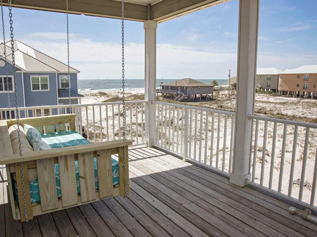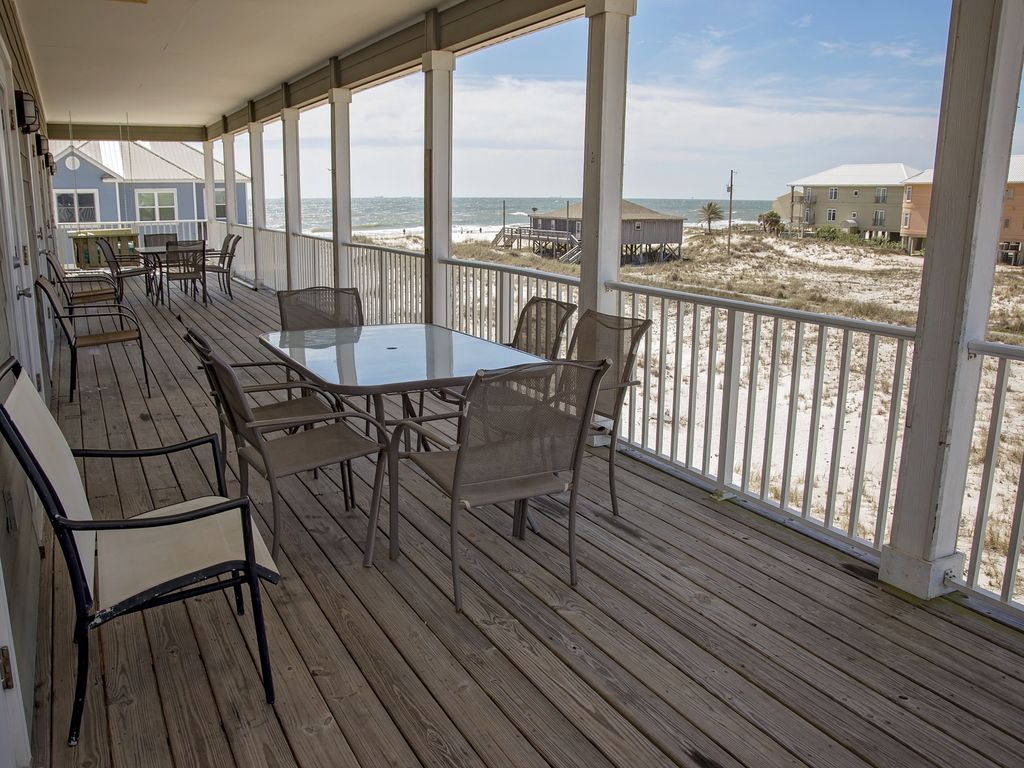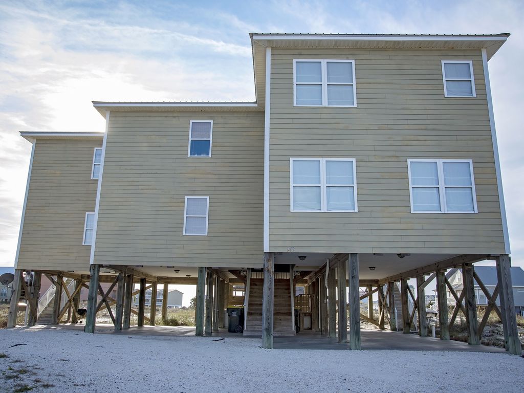 Call 18002107914 to speak to local experts Hang 10 is second tier but has a fantastic view of the Gulf and beach from the porches. Being located only one lot from the boardwalk to the white, sandy beaches, with no roads to cross, it is a very short walk to the beach! This home is as good as Gulf Front, without the price tag! This Gulf Shores/Fort Morgan beach house also has a private heated plunge pool, along with a community pool just across the neighborhood street.Hang 10 beach house was recentl heavily remolded and is tiled throughout, has custom cabinetry, Jenn-Air appliances, granite counter tops, and much more!Ground level -Ample parking2 park style charcoal grillsPlung PoolHang 10 has 2 floors of living area. The first floor has 8 bedrooms and 4 full bathrooms (all bathrooms are shower/tub combos). 4 of the bedrooms on this level have access to the first floor balcony. The laundry area is also on this floor. The second level of Hang 10 is the main floor and has a large, open living room, . The kitchen overlooks the living room area and has 2 stoves, 2 dishwashers, 2 sinks, and 2 refrigerators. The dining area is right off of the kitchen and has seating for 14 at the custom dining table with an additional 4 seats at the kitchen counter. There are 2 master bedrooms on this floor and has its own master bathroom with both a sub and walk in shower. There is one half bath as well off of the living room area. Both of the bedrooms and the large living room have balcony access to the second floor balcony. Large balconies have lots of seating but the second floor balcony also has a hanging daybed.Bedding -First Floor Bedroom 1 - QueenBedroom 2 - QueenBedroom 3 - KingBedroom 4 - KingBedroom 5 - QueenBedroom 6 - QueenBedroom 7 - Bunk room with 2 sets of Twin over Twin bunk bedsBedroom 8 - Bunk room with 2 sets of Twin over Twin bunk bedsSecond FloorMaster Bedroom 1 - KingMaster Bedroom 2 - KingSleeps up to 24 More details